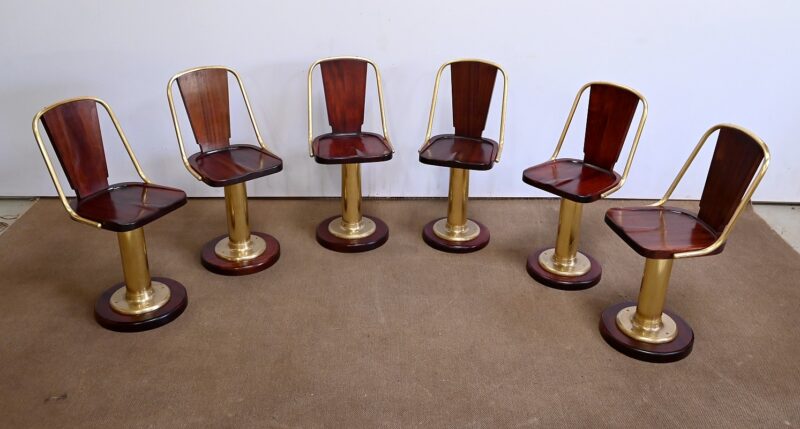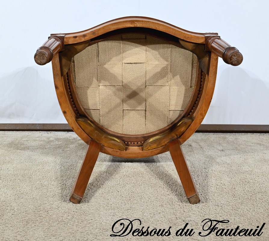 Les montants rejoignent un petit dossier concave, propre au fauteuil gondole, avec accotoirs en retrait.