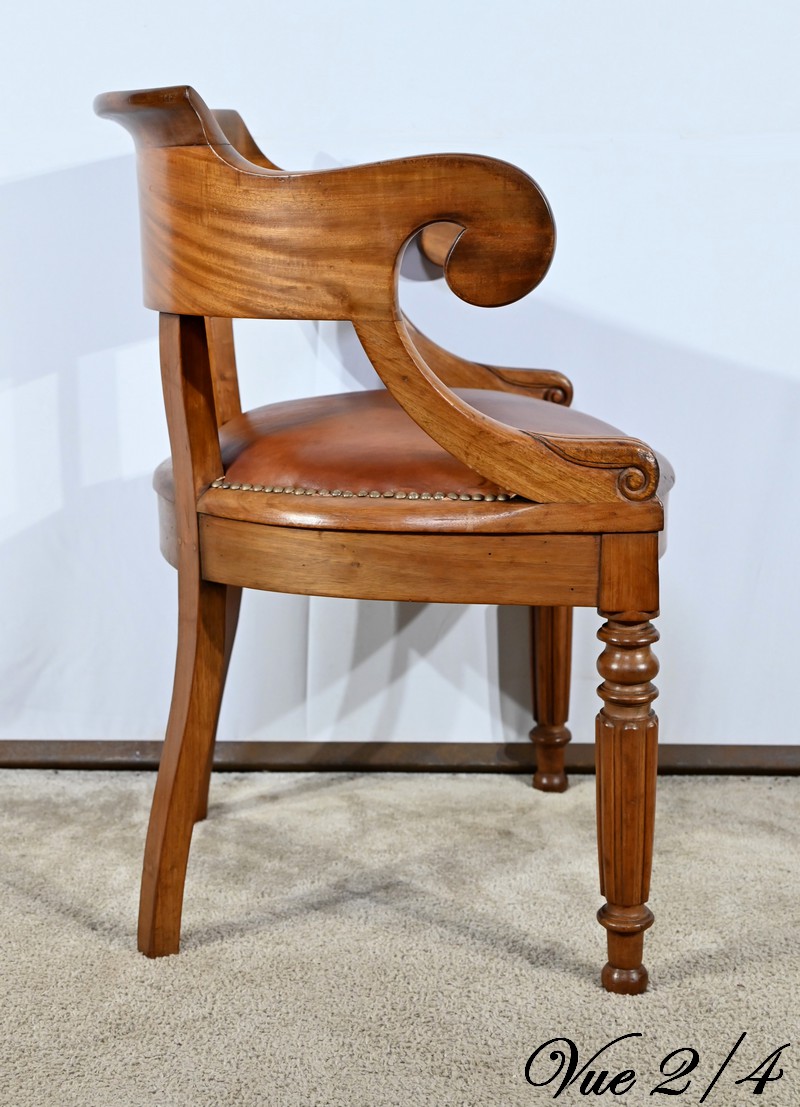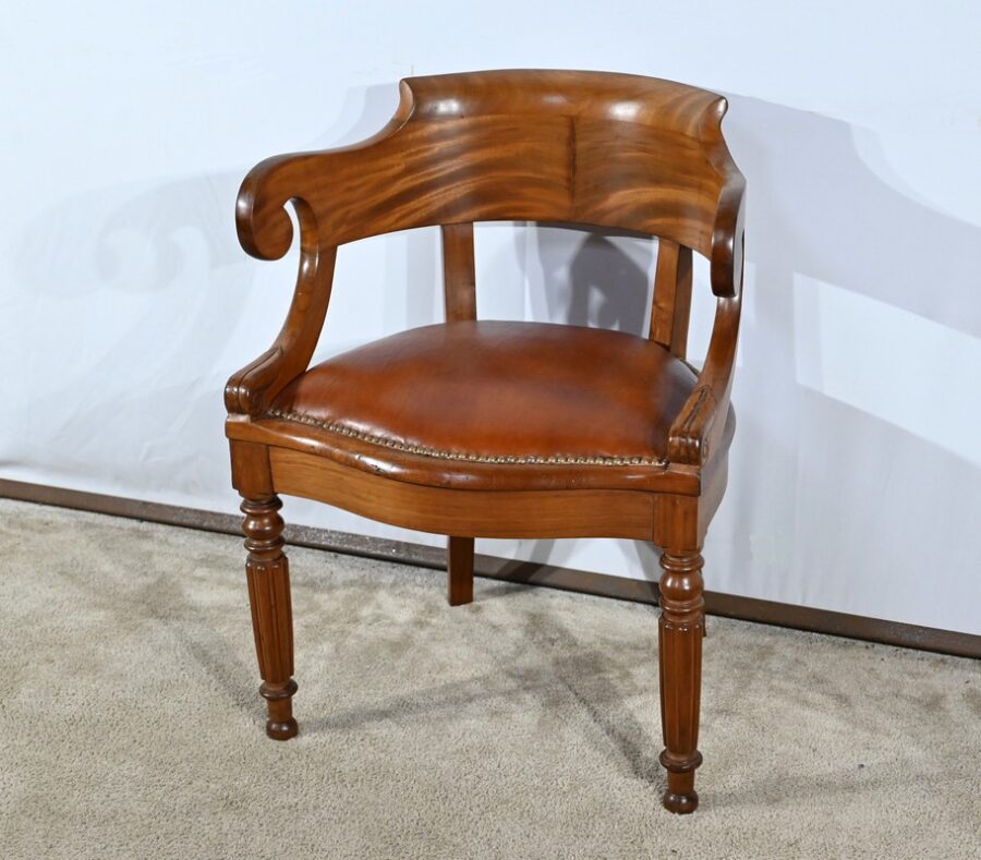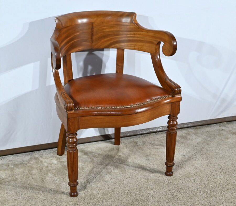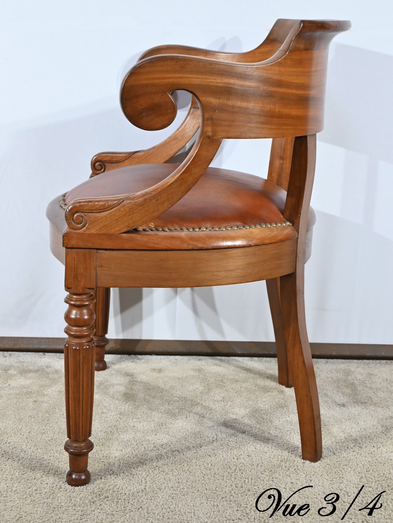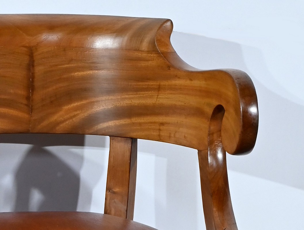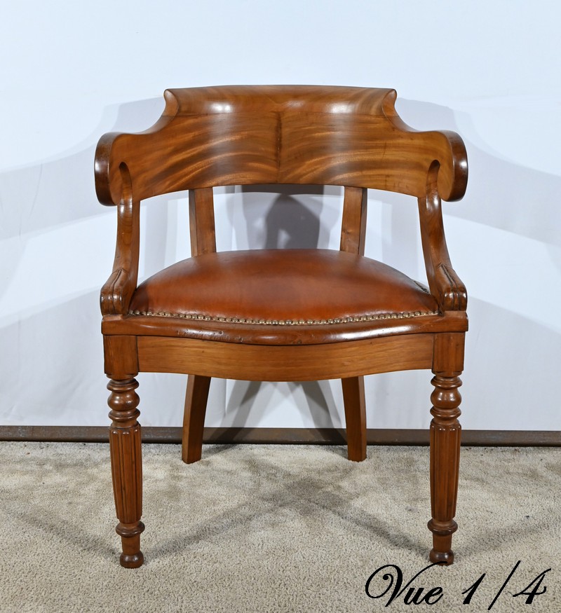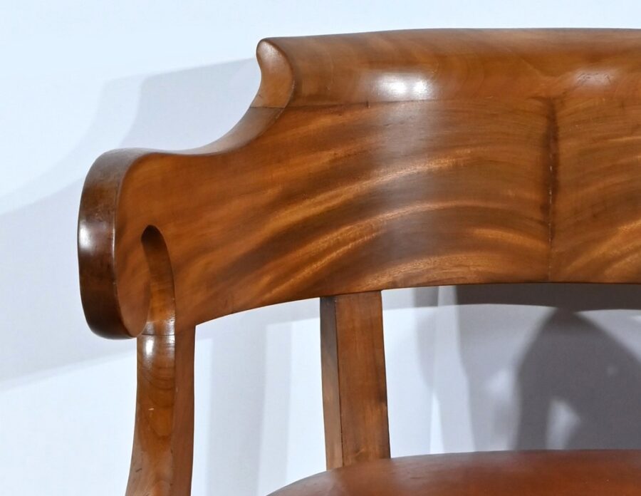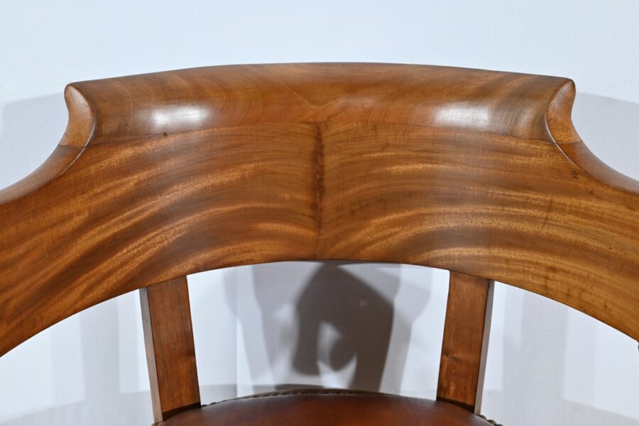 Ce fauteuil de bureau de forme gondole en acajou repose sur des pieds tournés à étranglement, annelés et à godrons à l’avant.