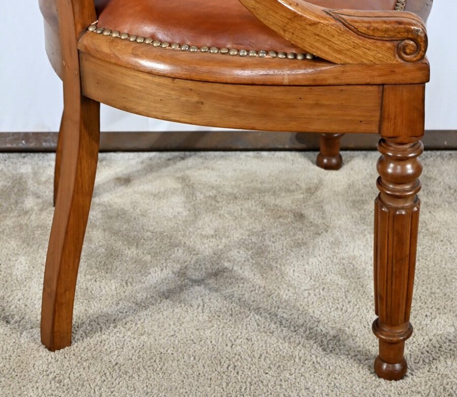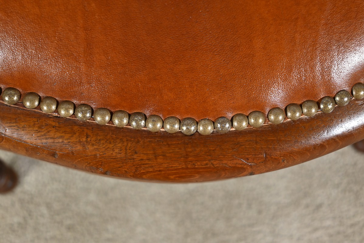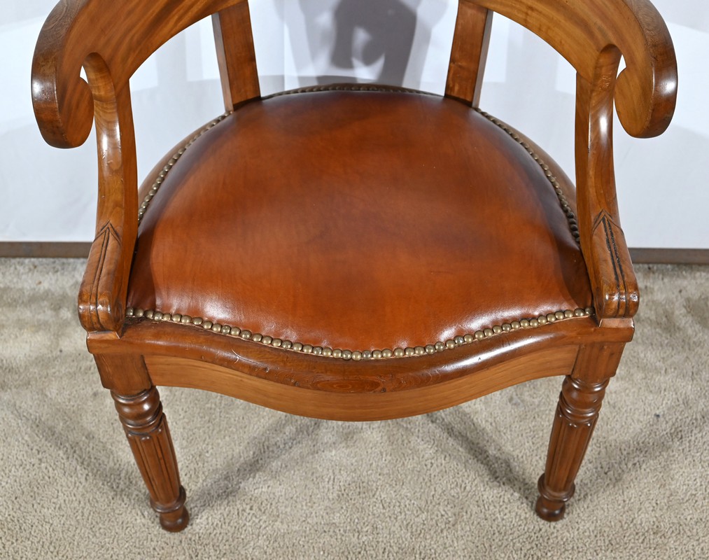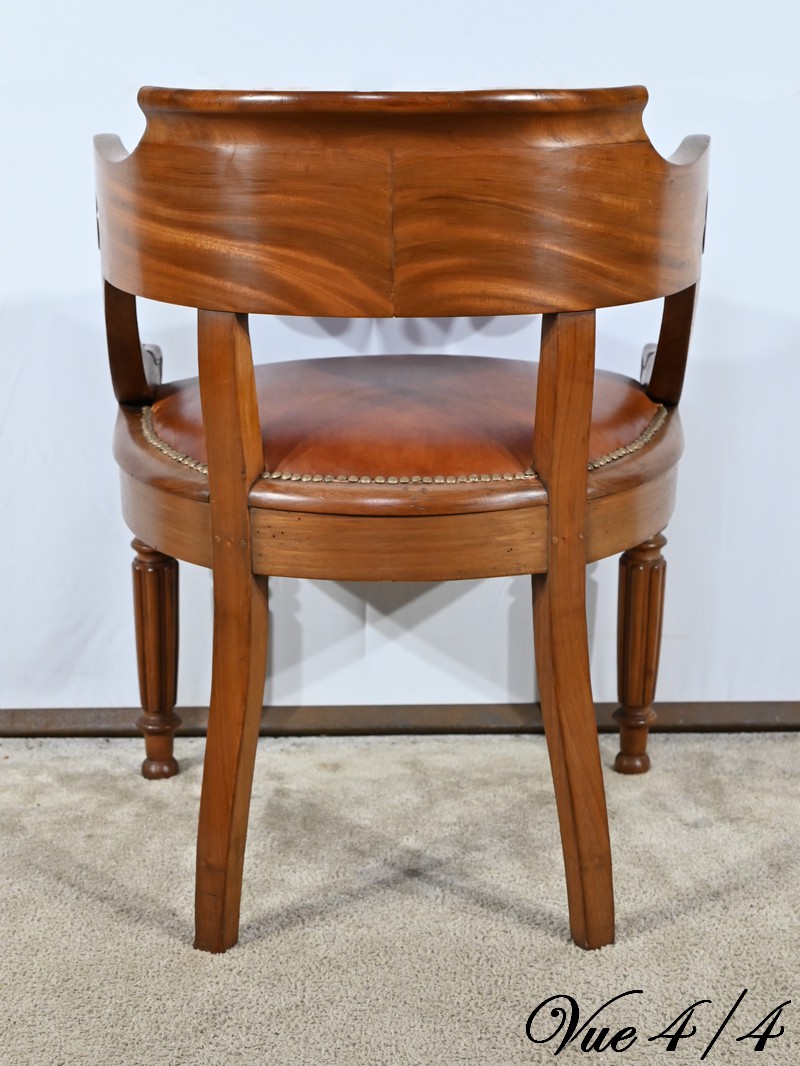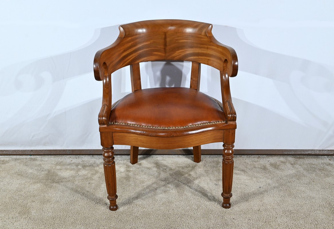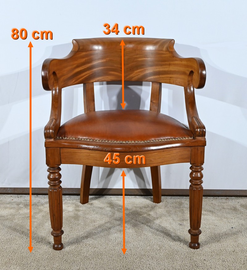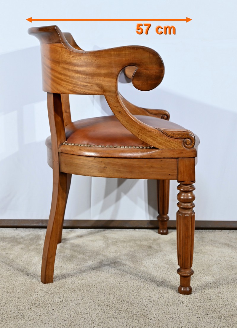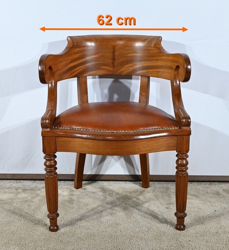 Ce fauteuil de bureau de forme gondole en acajou repose sur des pieds tournés à étranglement, annelés et à godrons à l’avant.