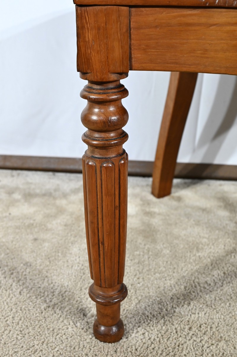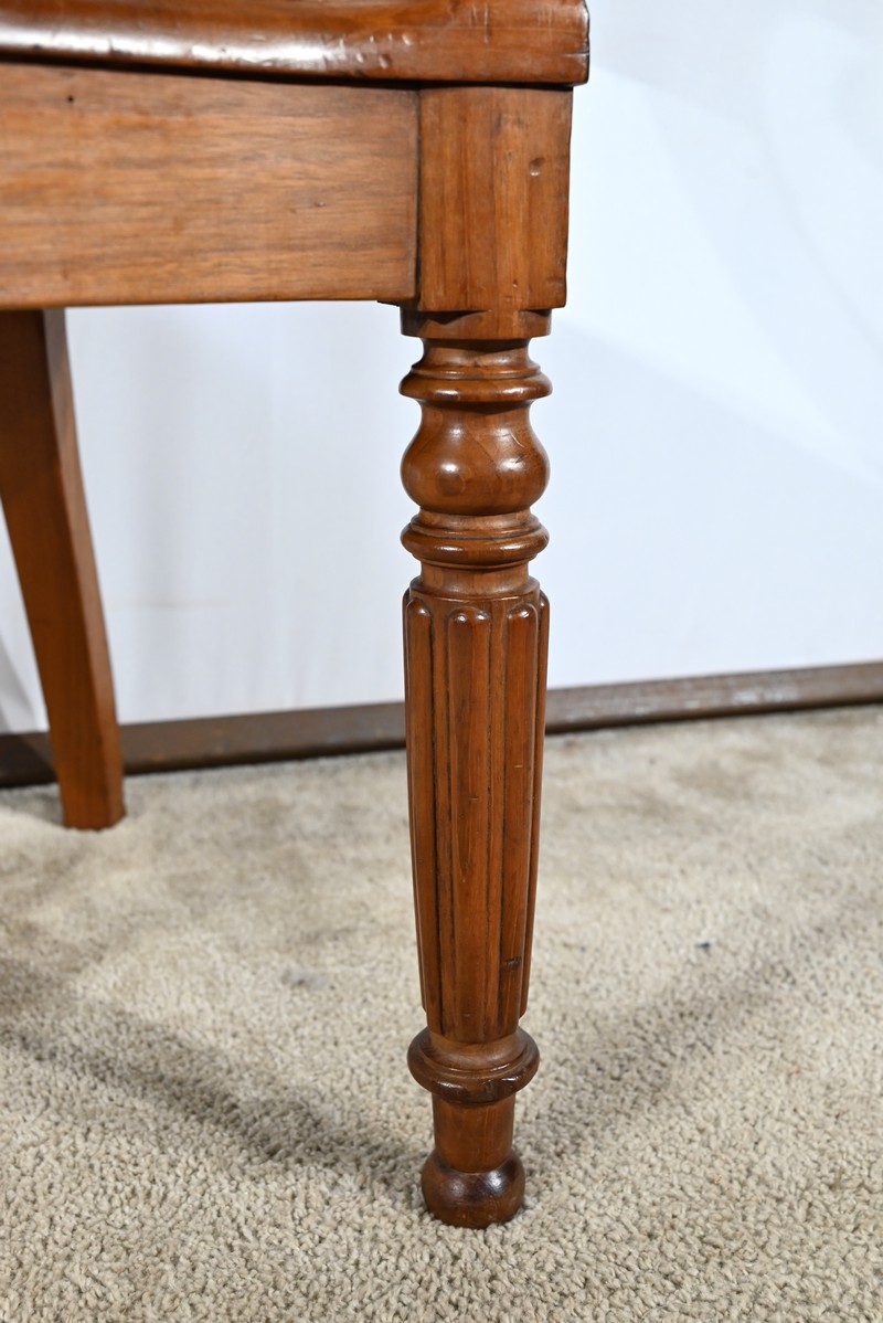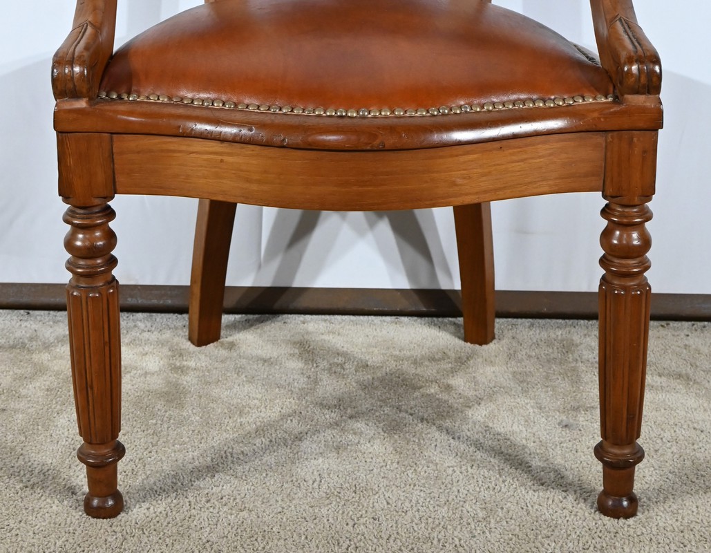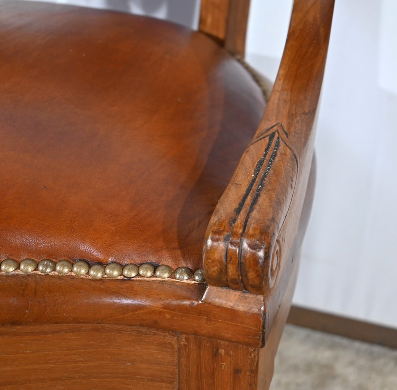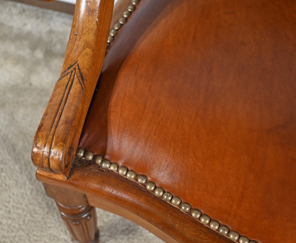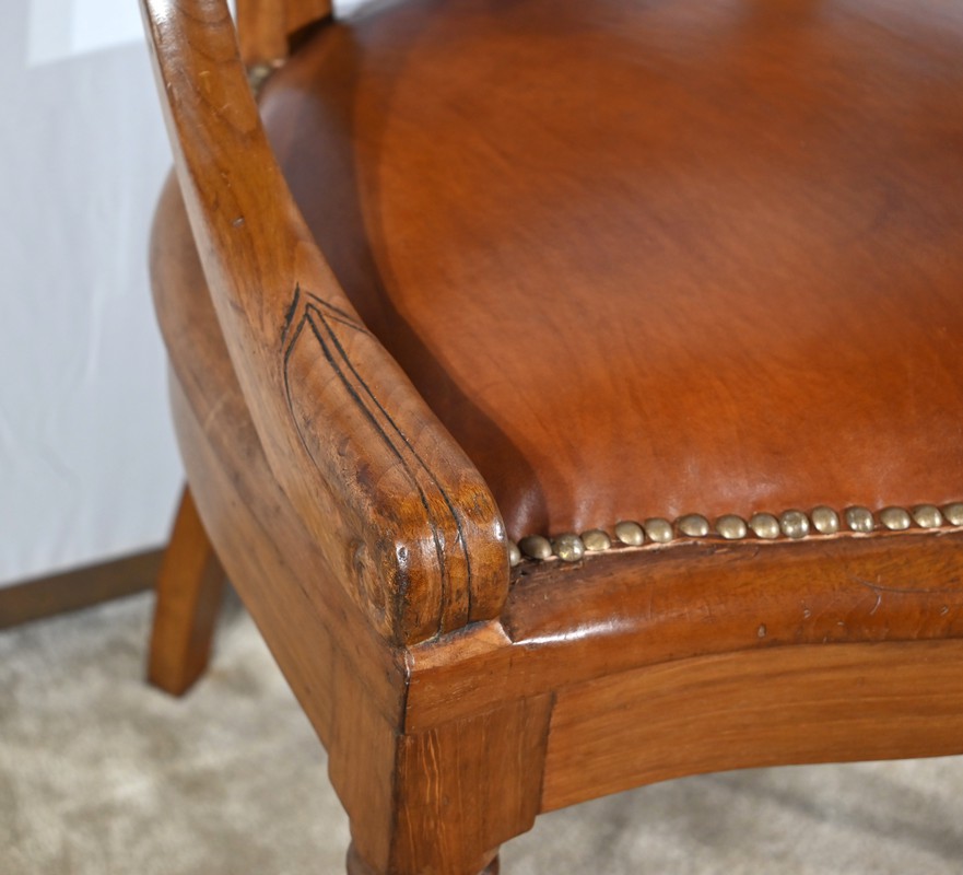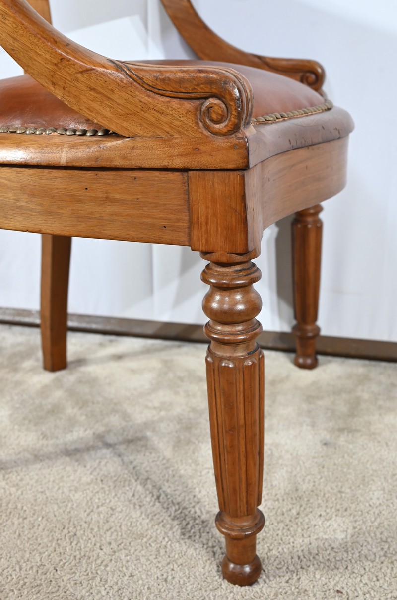 Ce fauteuil de bureau de forme gondole en acajou repose sur des pieds tournés à étranglement, annelés et à godrons à l’avant.