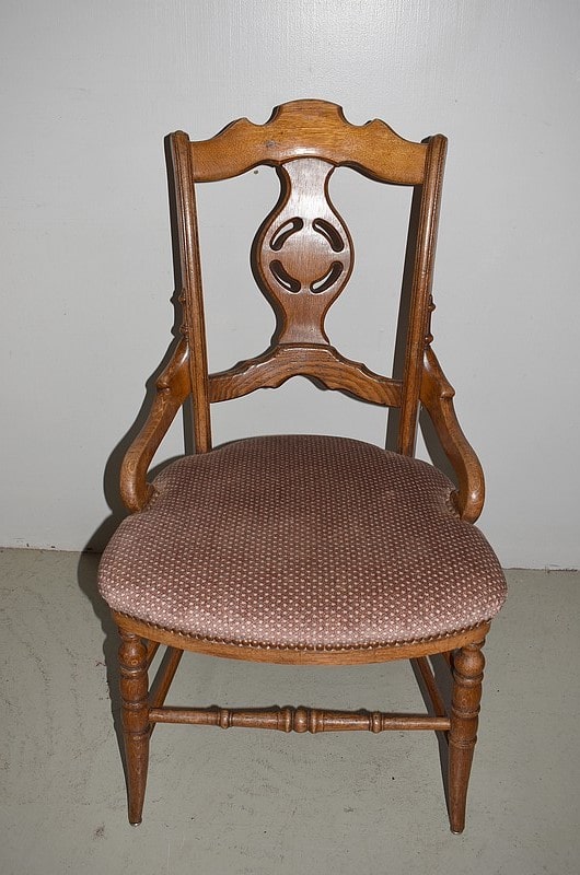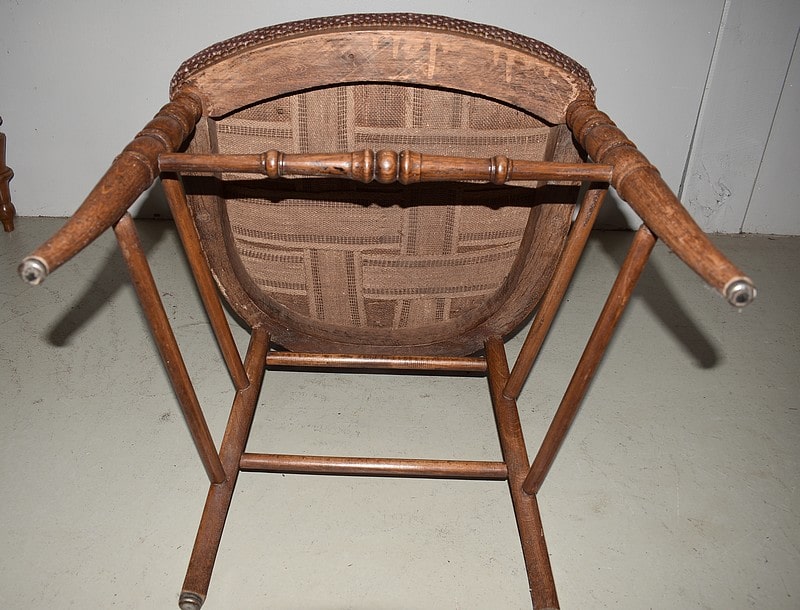 Pieds avants tournés reliés par un barreau également tourné et pieds arrières ‘sabre’ reliés par un barreau. Les côtés sont consolidés par deux barreaux tournés.