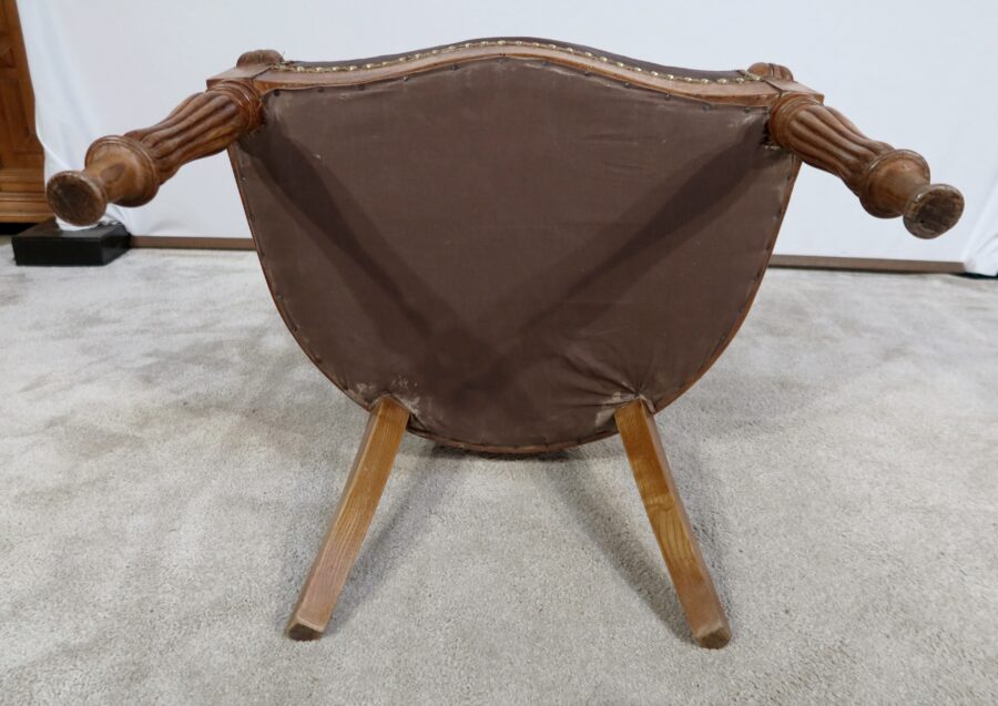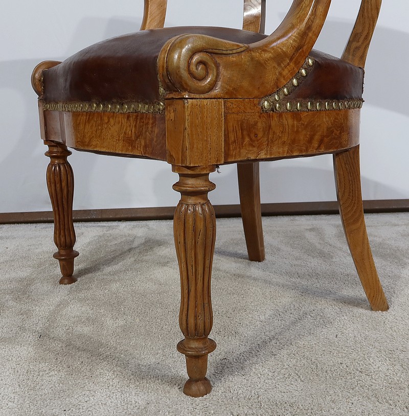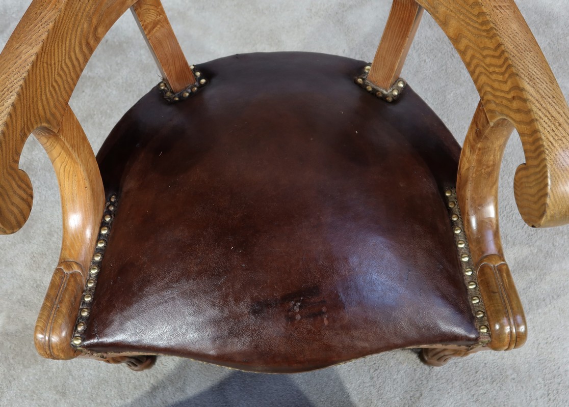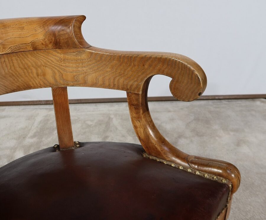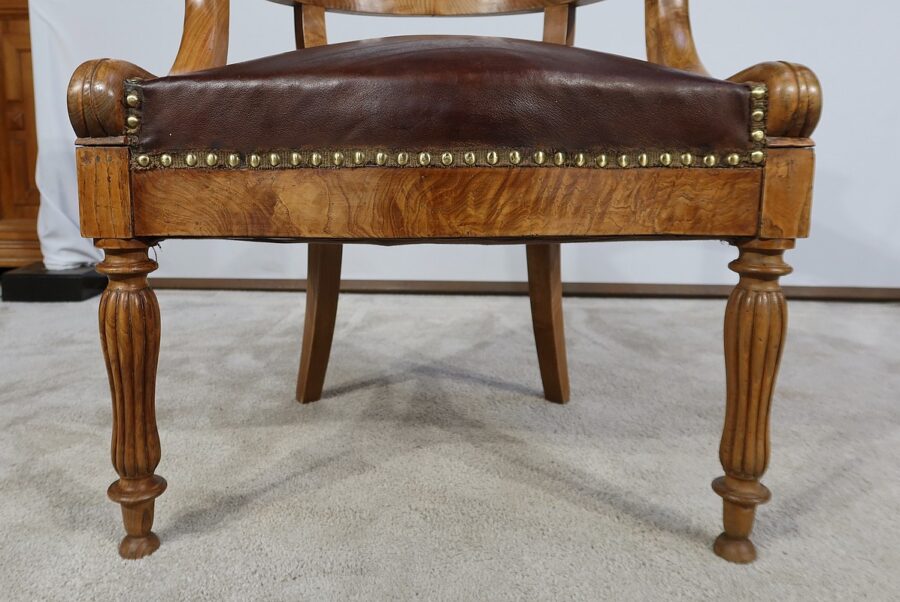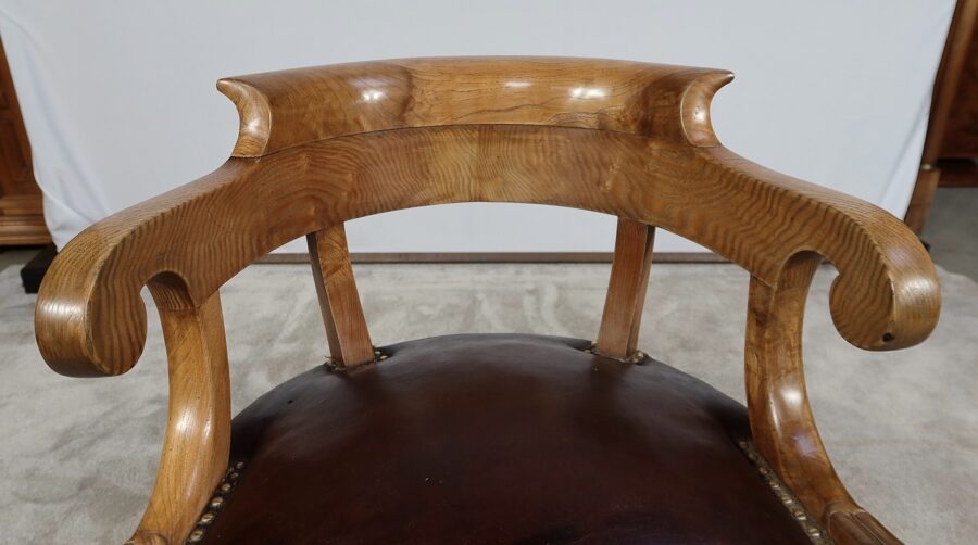 Beau fauteuil en frêne massif garni d’un cuir. Ce siège de caractère repose sur deux pieds tournés à godrons en partie avant et deux pieds cambrés à l’arrière. La ceinture aux formes courbes se remarque par son veinage seyant. L’assise, quant à elle, est garnie d’un cuir marron clouté solidement.