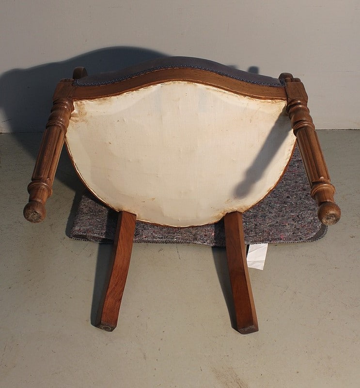 Son assise, sur ressorts et en très bon état, est recouverte d’un tissu bleu nuit, avec finitions Galons.