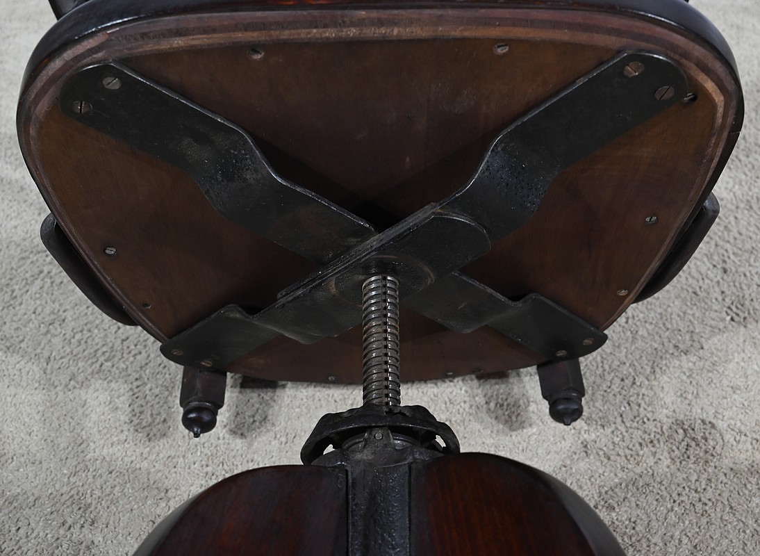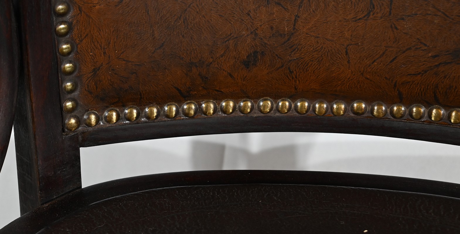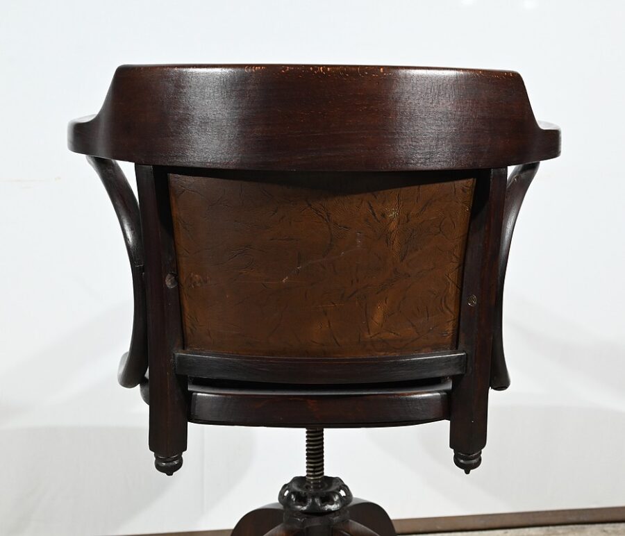 Fauteuil pivotant en hêtre teinté inspiré du modèle n°164 de Baumann. Datant des années 1940, ce fauteuil possède une assise à encadrement, foncée d’un cuir de vache épais de couleur noire. Le dossier enveloppant possède des accoudoirs courbés rejoignant l’encadrement de l’assise. Le dos est garni d’un cuir marron plus clair et clouté. Ce siège est doté d’un piétement quadripode. Les quatre pieds mouvementés sont réunis par un élément de fer maintenant un système à vis, coulissant, permettant à ce fauteuil pivotant d’être réglable en hauteur.