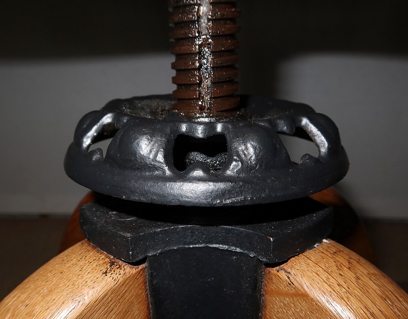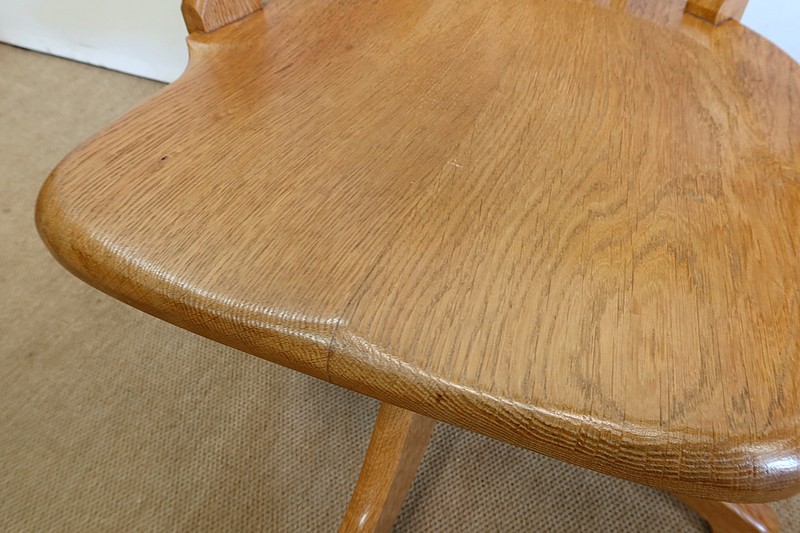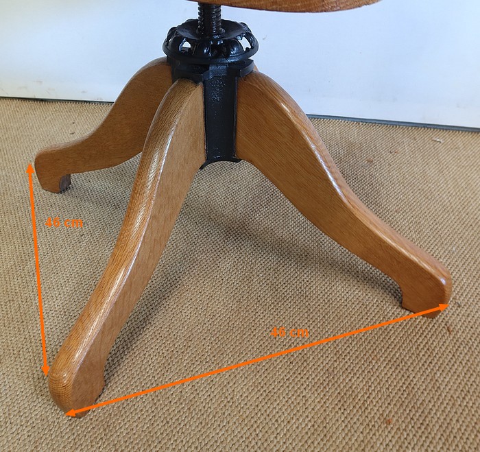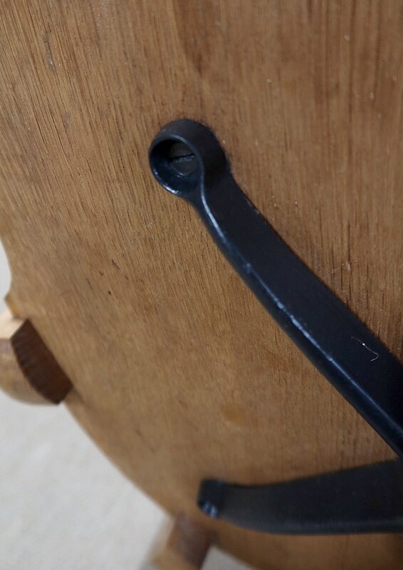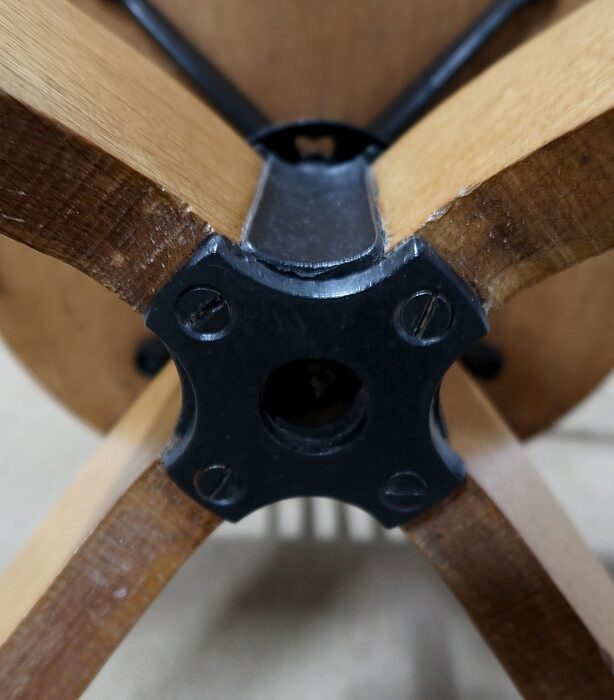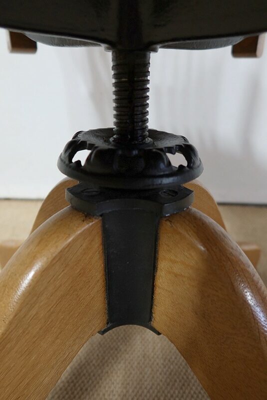 On notera que l’assise est légèrement creusée, et épousera ainsi les formes de son occupant. Elle est soutenue par un croisillon en fonte, relié à un pied quadripode.