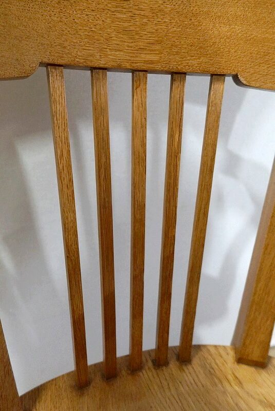 Son dossier trapézoïdal est incurvé et finement barreauté verticalement.
