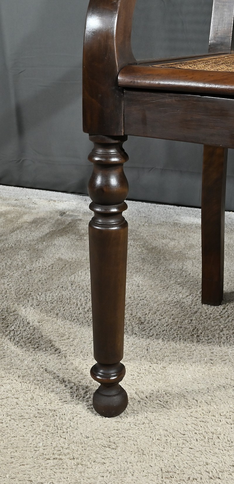 Les accotoirs ajourés forment une crosse et reposent sur les pieds tournés à l’avant du fauteuil.