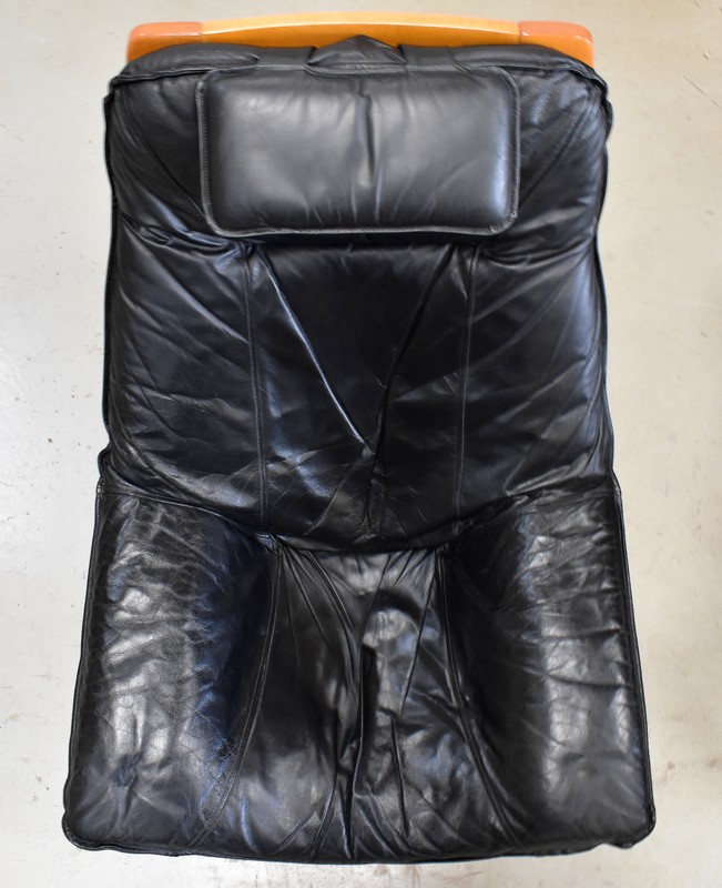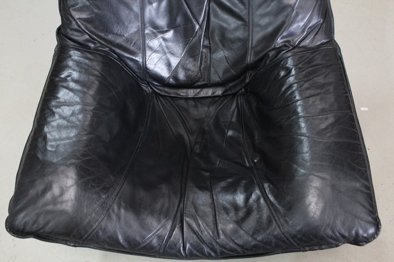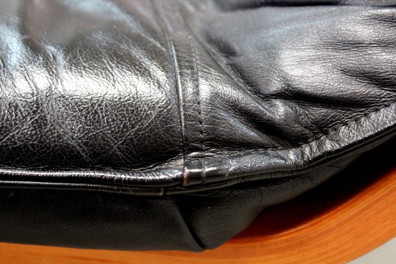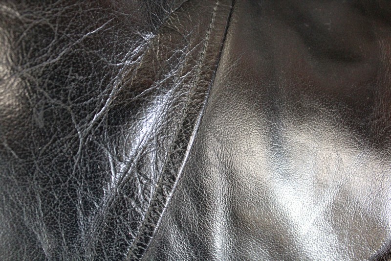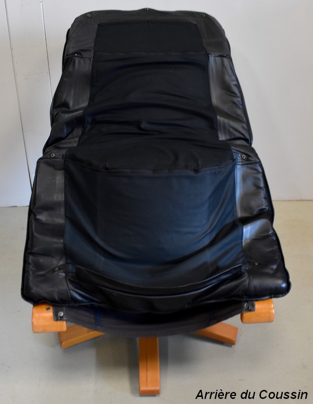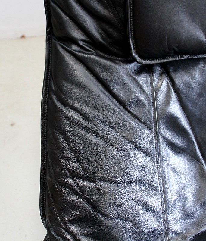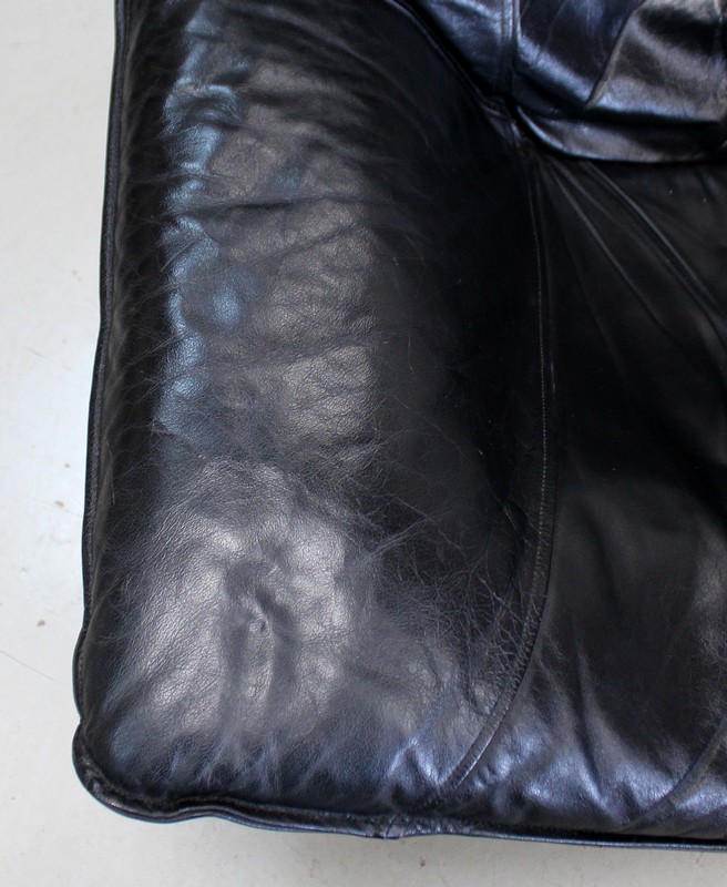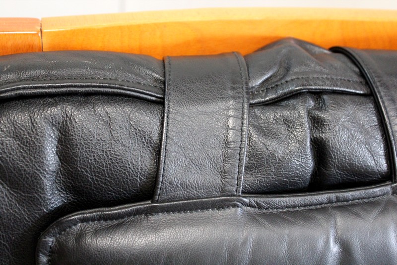 Il est garni d’un grand coussin Déhoussable, Rembourré et Moelleux. Ce dernier est recouvert d’un Cuir Véritable, Naturel, d’un Noir Profond et d’une Qualité Exceptionnelle, avec Piqures à point Sellier.