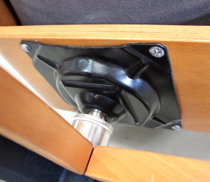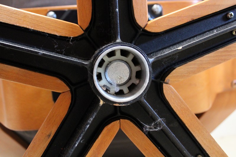 L’assise, conçue avec Mouvement d’accoudoir, est soulignée par un élément en Hêtre épousant idéalement sa forme. C’est sur cette composante qu’est fixé un Piétement en Étoile à cinq branches d’étais en fer et en Hêtre. Elles sont reliées à la base par un Système en Métal Chromé permettant à ce Siège de Pivoter.