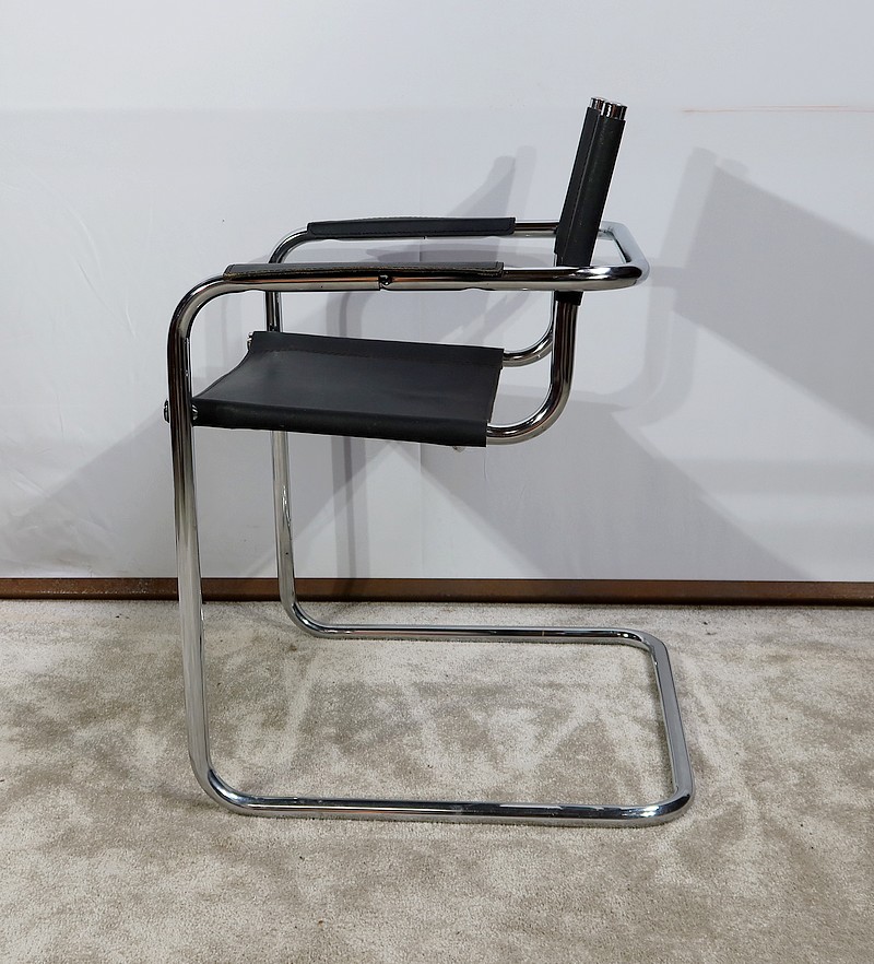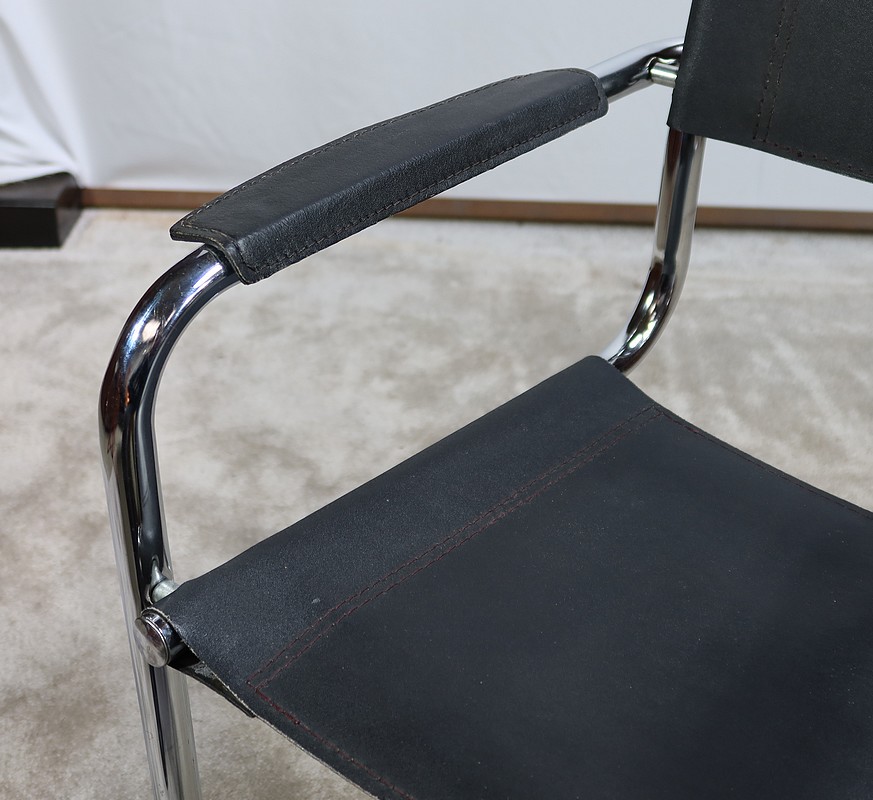 Fauteuil noir en cuir reprenant le modèle B34 de Marcel Breuer édité dans les années 1930.