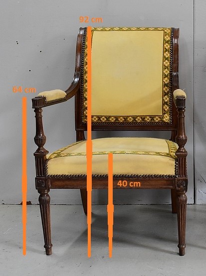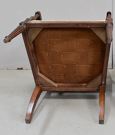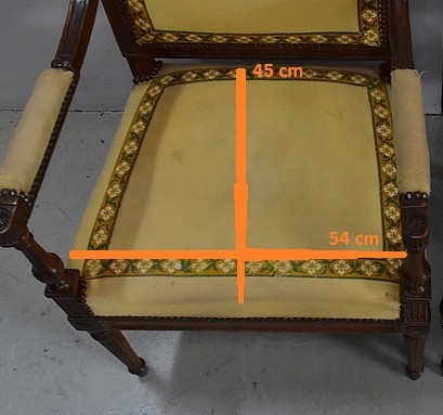 Les accotoirs sont pourvus de Manchettes. Ils sont à l’aplomb et supportés par des consoles en Balustres. Ces dernières se prolongent par des angles à Décors de Rosaces et des pieds Cannelés. Là où ces deux pieds de l’avant sont fuselés, ceux de l’arrière sont Sabres.