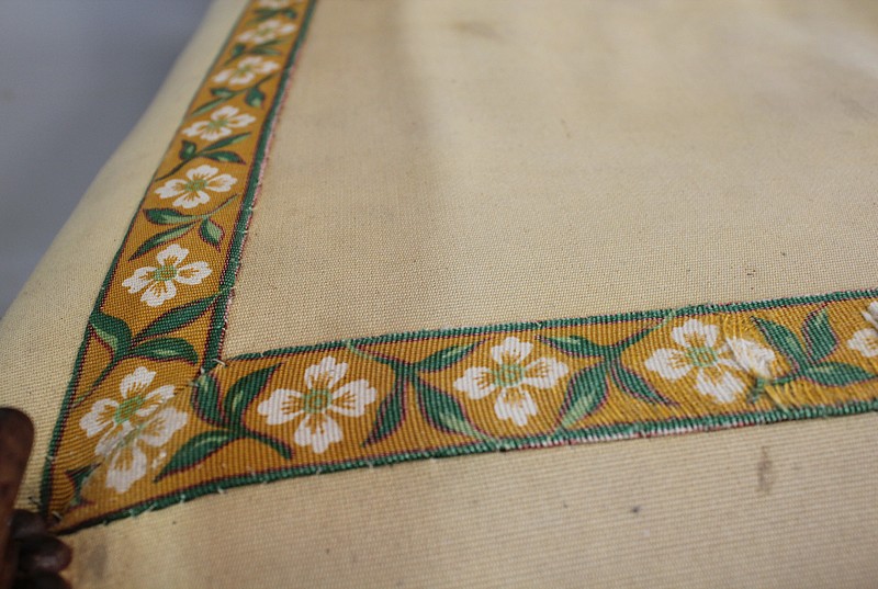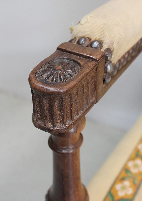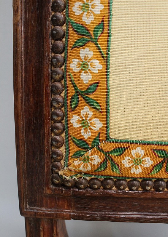 Il est recouvert d’un Tissu de couleur Jaune à finitions Clous. Son revêtement, en état d’usage, est bordé de Frises fleuries aux teintes Orangées et Vertes.