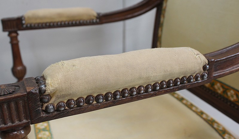 Parfait état de Bois après restauration dans notre atelier. Tissu en état d’usage. Finition uniquement Cirée.