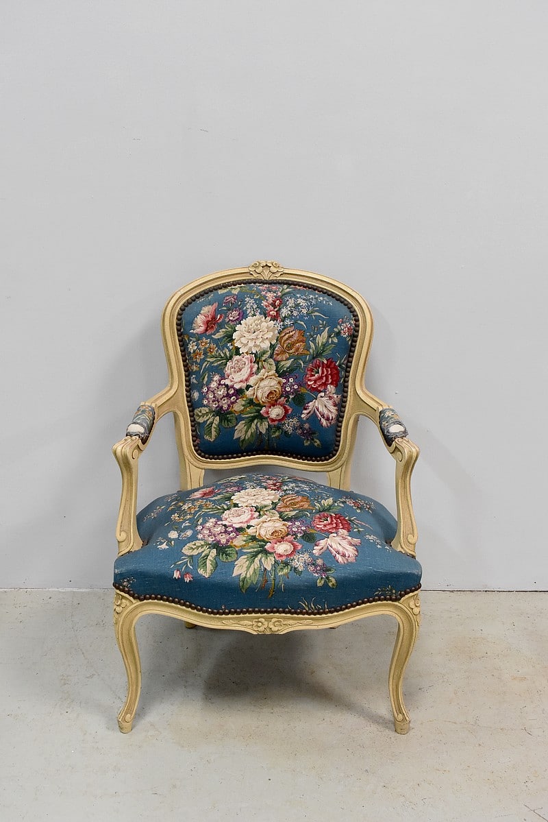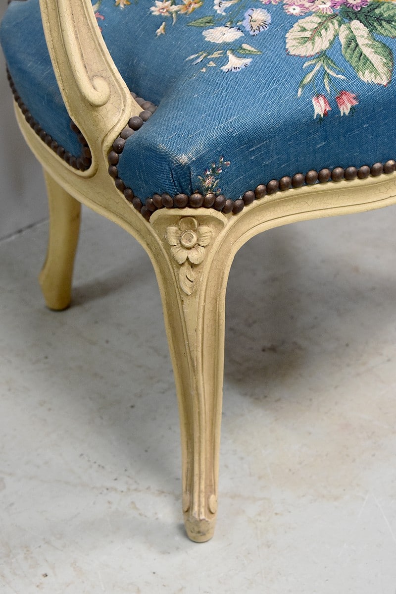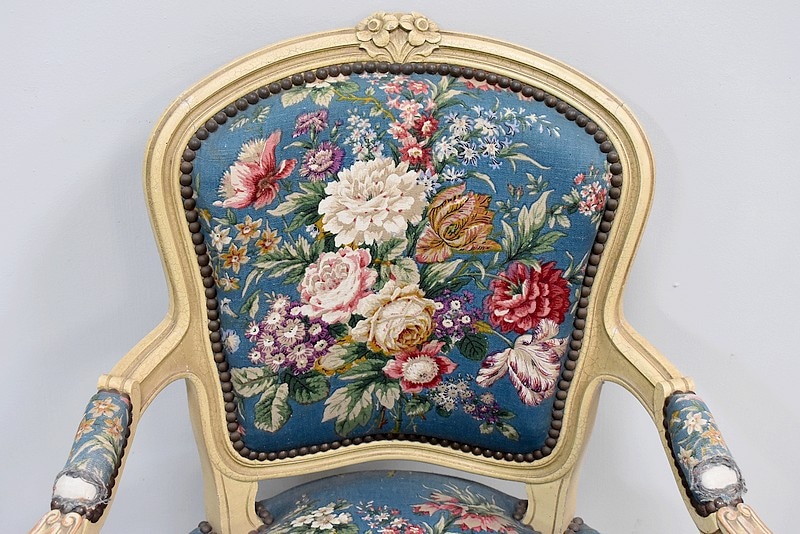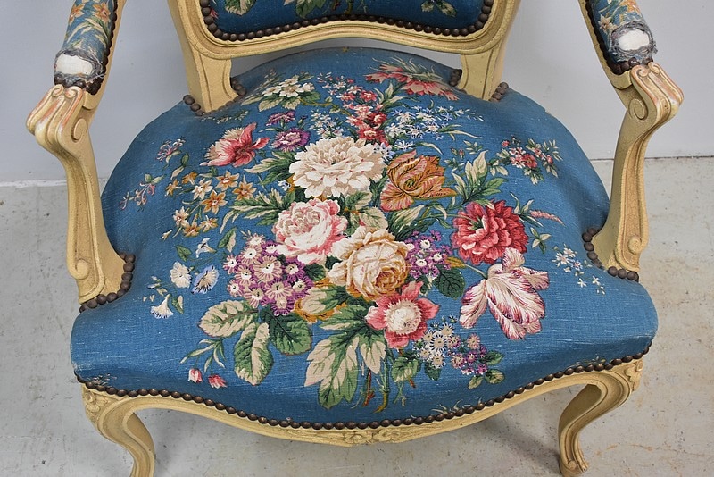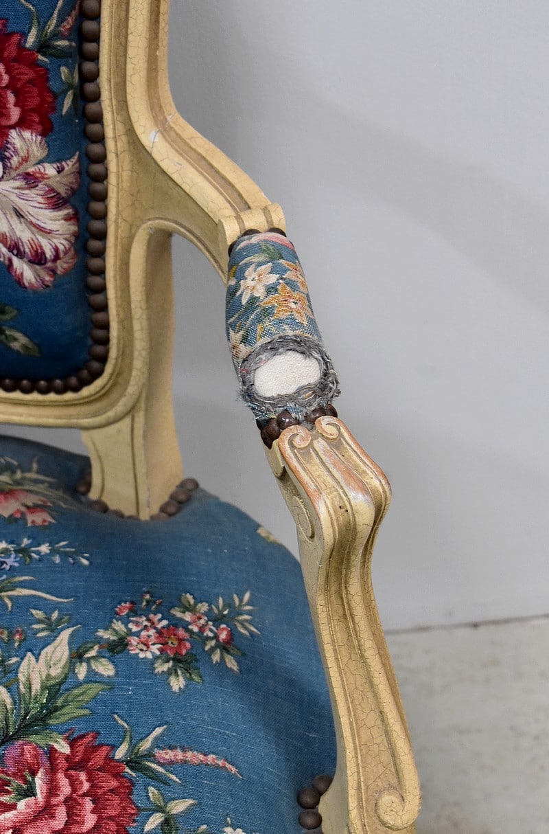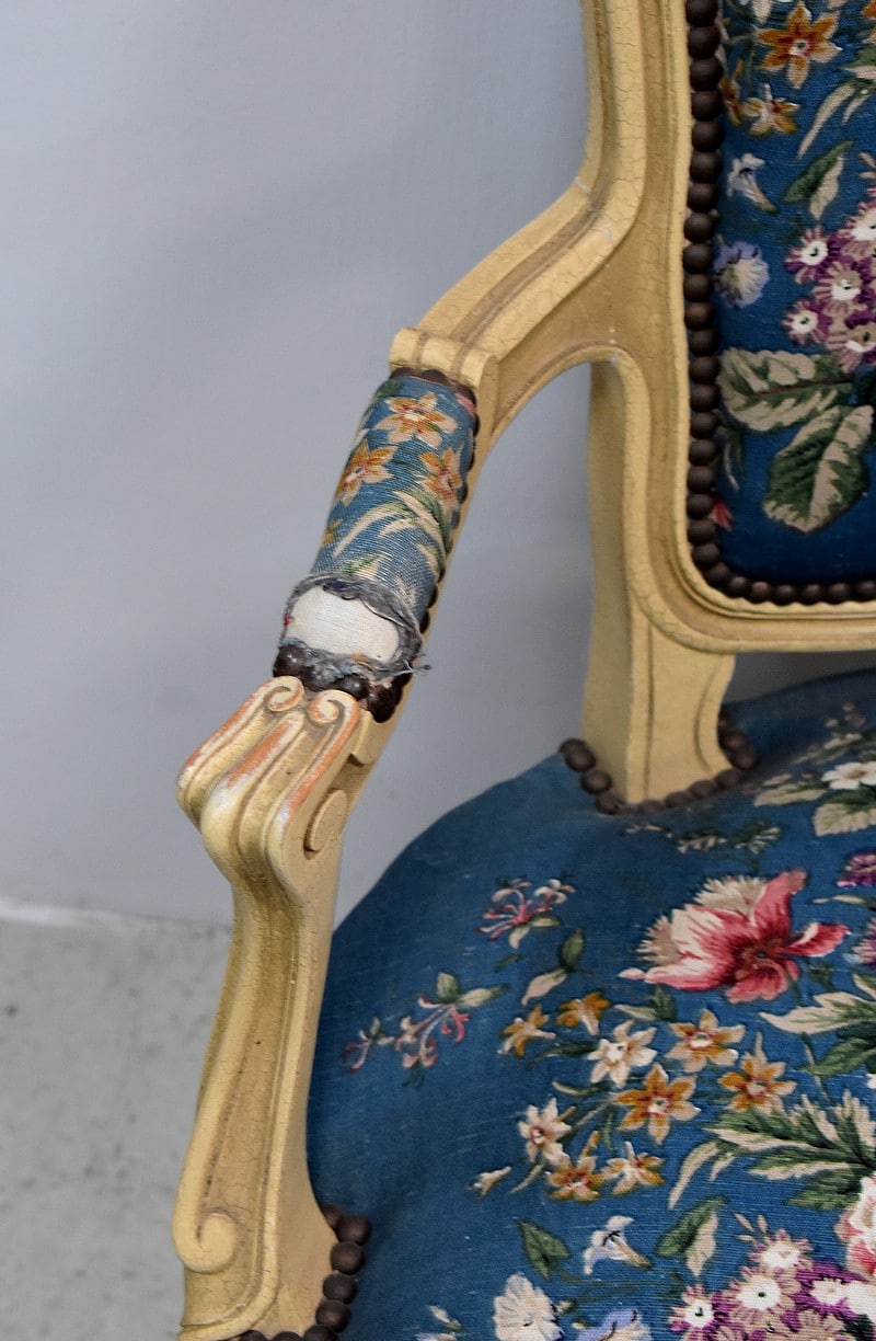 Il est recouvert d’un tissu de couleur bleue à décors d’un bouquet de fleurs polychrome sur l’assise, le dossier et les manchettes et ces dernières sont abîmées.