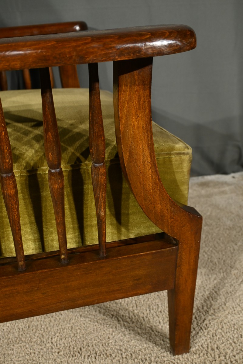 Les accotoirs plats sont finement barreaudés, ajoutant une touche de sophistication à l’ensemble.