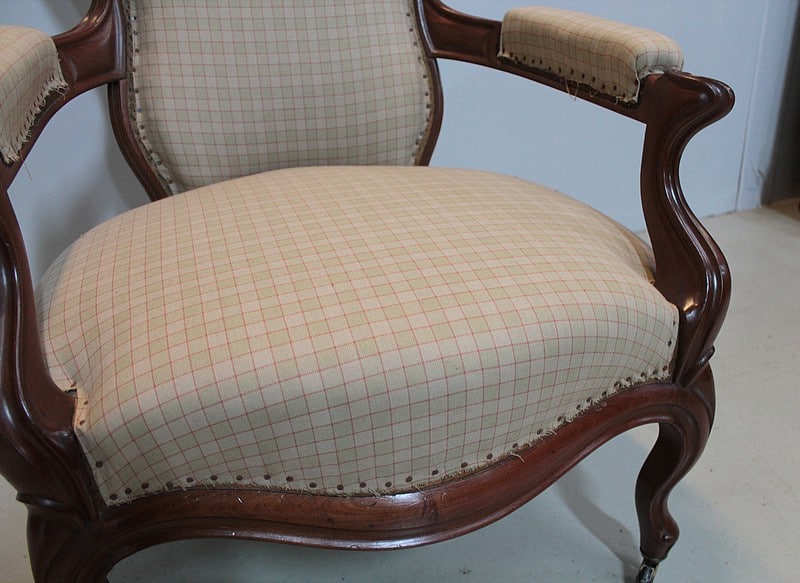 Le fût a été équerré et la tapisserie a été entièrement refaite, à l’ancienne, avec crins et ressorts sur sangles de jute. Il ne reste que le tissu final à poser.