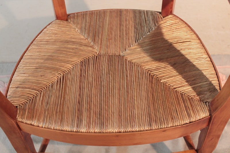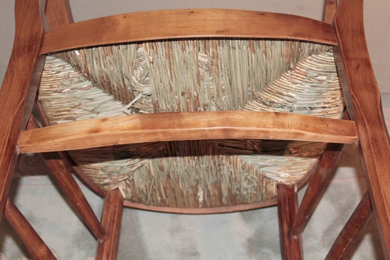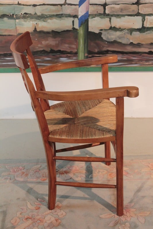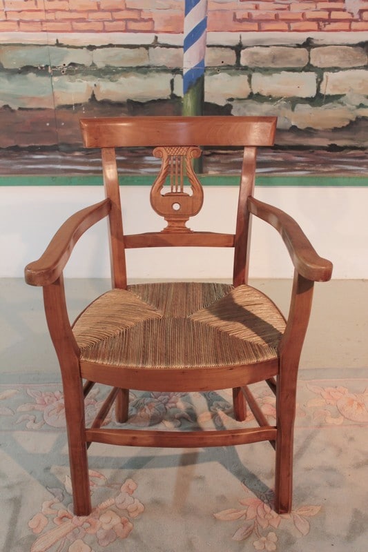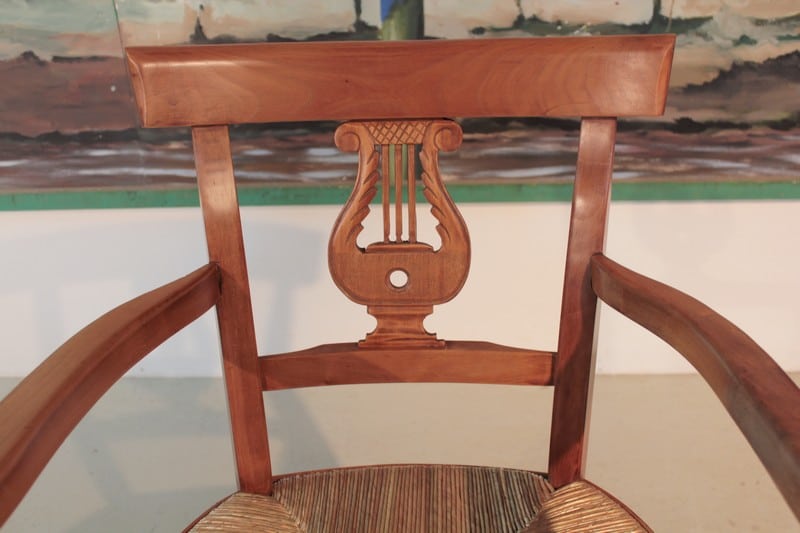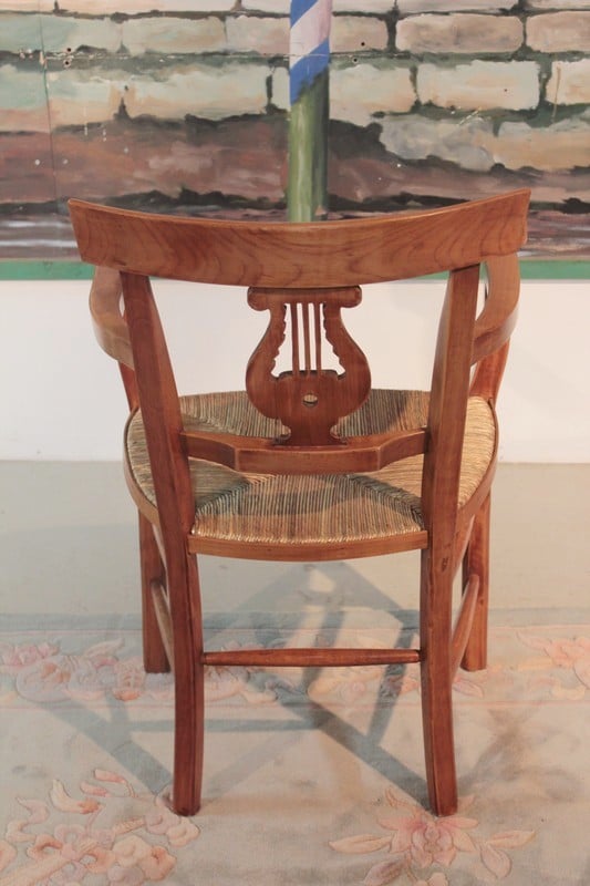 Fauteuil paillé dans le goût Directoire. Le dossier est ajouré d’une lyre. Compte tenu de sa hauteur d’assise, il peut être utilisé en fauteuil de bureau. Paillage refait. Époque : seconde moitié du XIXe