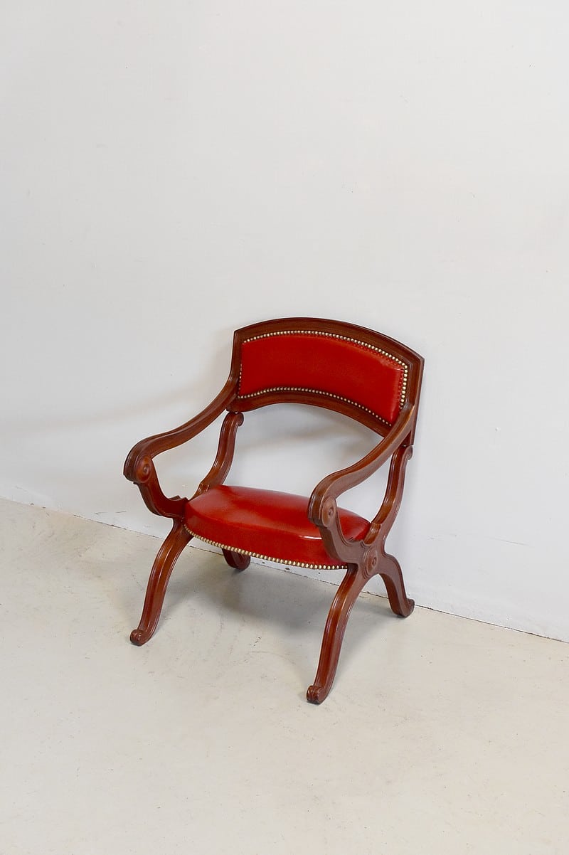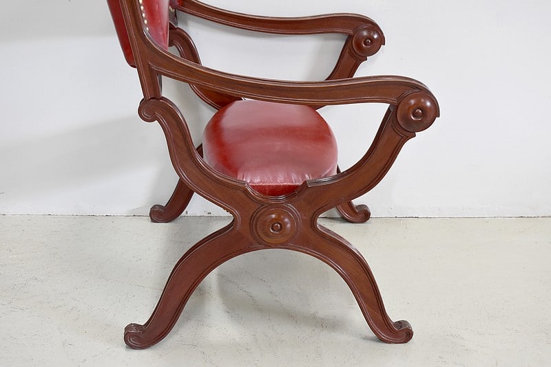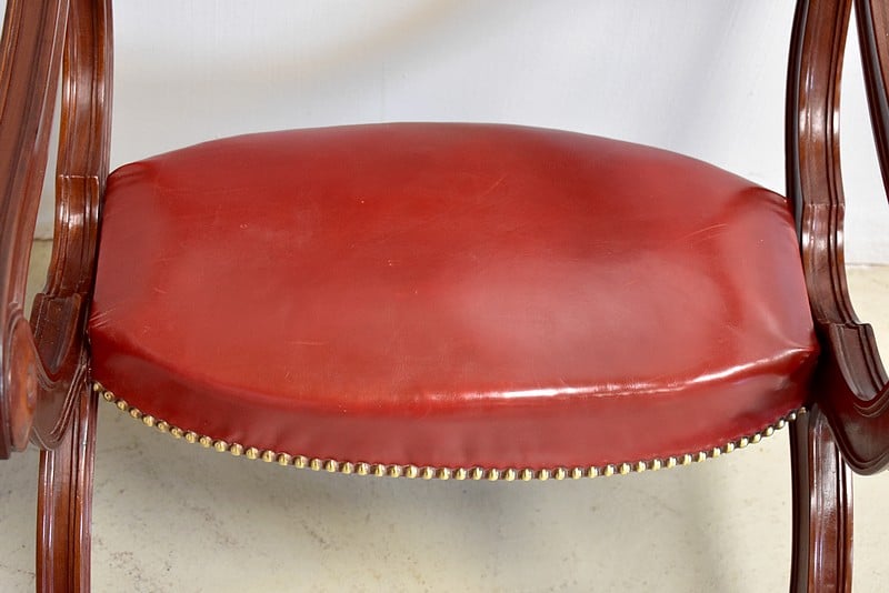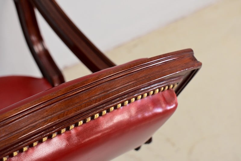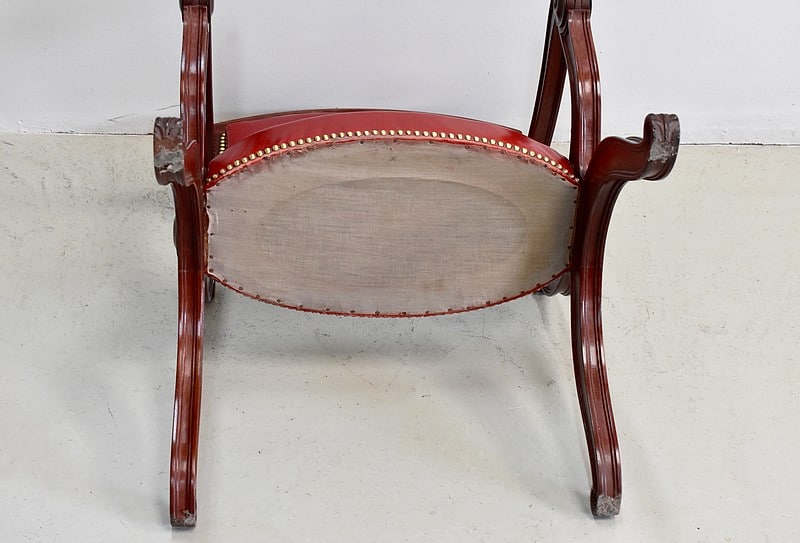 L’assise, le dossier et le repose-main sont recouverts d’un cuir rouge postérieur en très bon état clouté aux pourtours.
