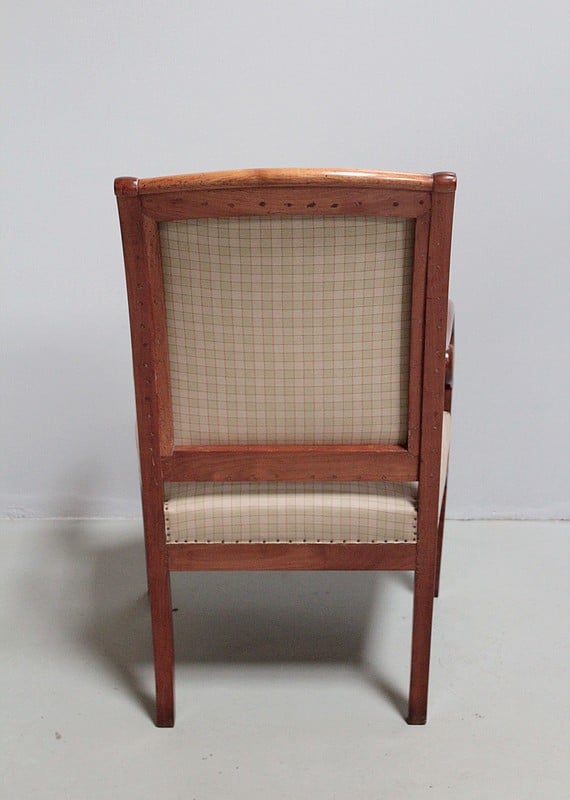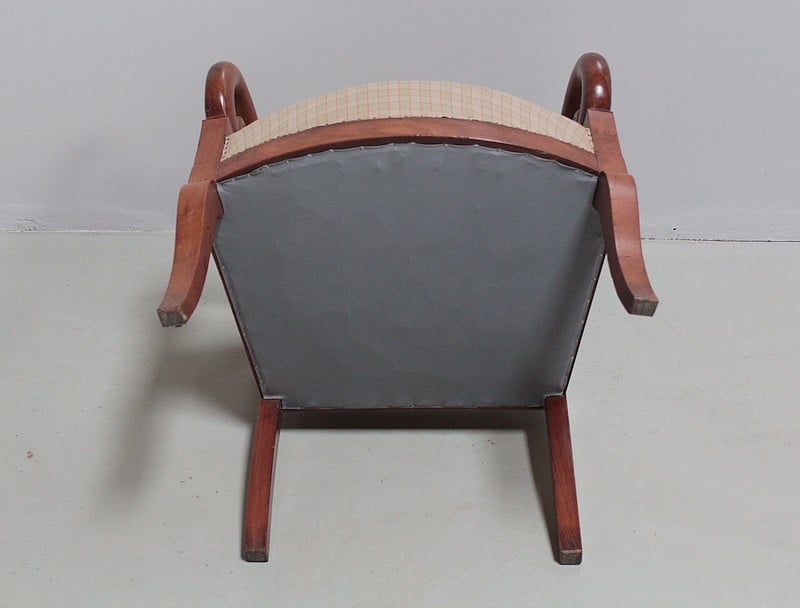 Fauteuil Restauration en merisier. Accotoirs à crosses et pieds sabre.