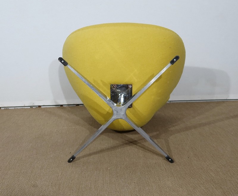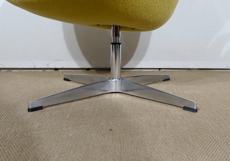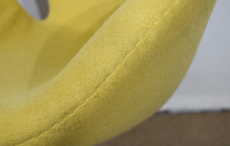 Elégant et fluide, ce fauteuil tournant est garni d’un lainage jaune canari soutenu par une coque au dossier incurvé à oreilles.