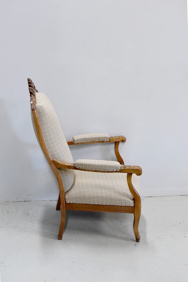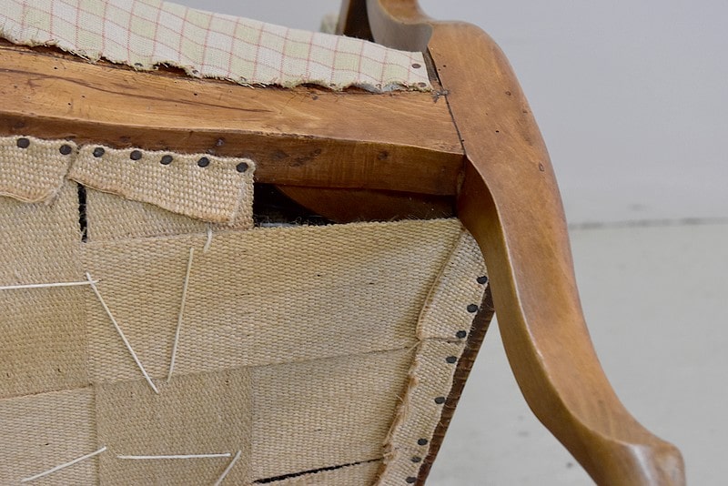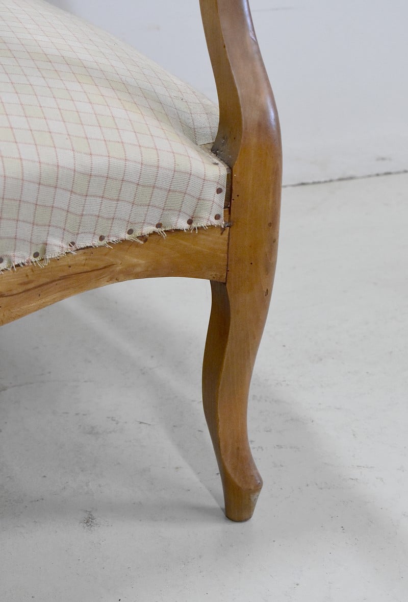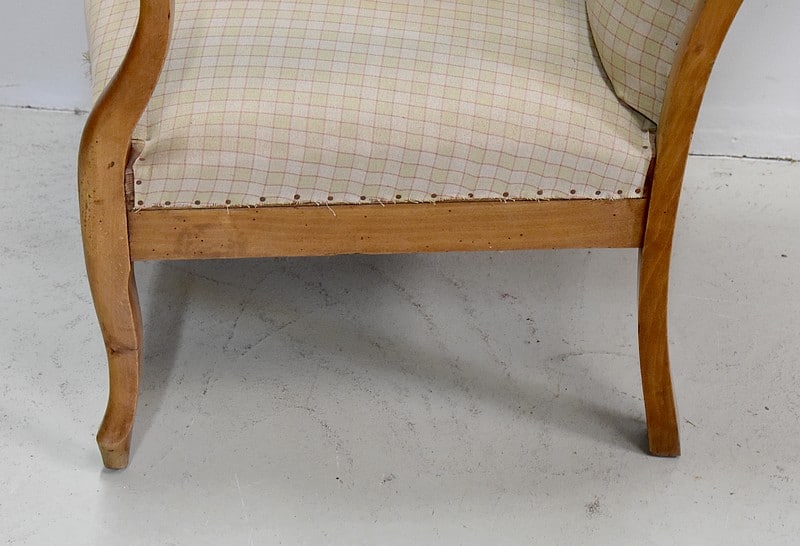 Le dossier, l’assise ainsi que les accotoirs ont été refaits à l’ancienne et recouverts d’un tissu d’apprêt laissant libre choix à l’acquéreur du tissu final.