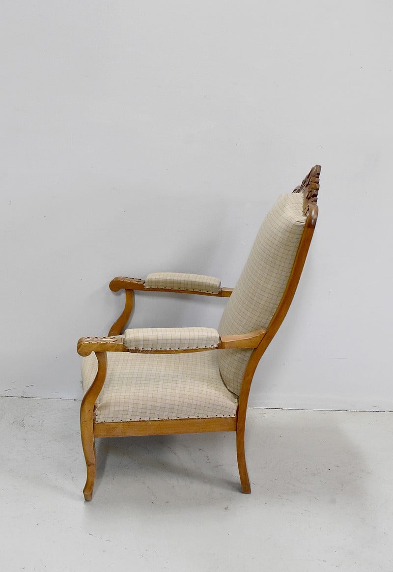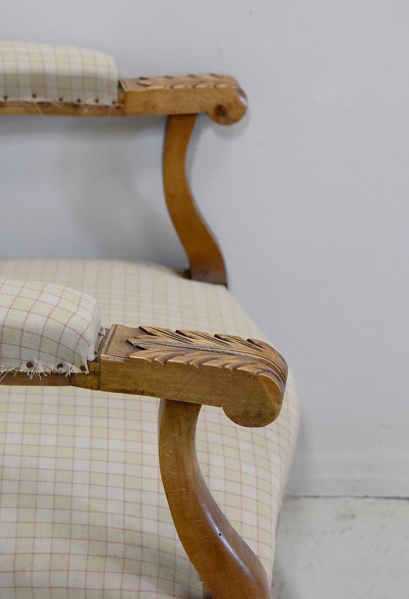 Le haut du dossier en chapeau de gendarme est orné d’un fronton sculpté de fleurs et de rinceaux stylisés et les extrémités des accotoirs sont sculptés d’une feuille d’Acanthe.