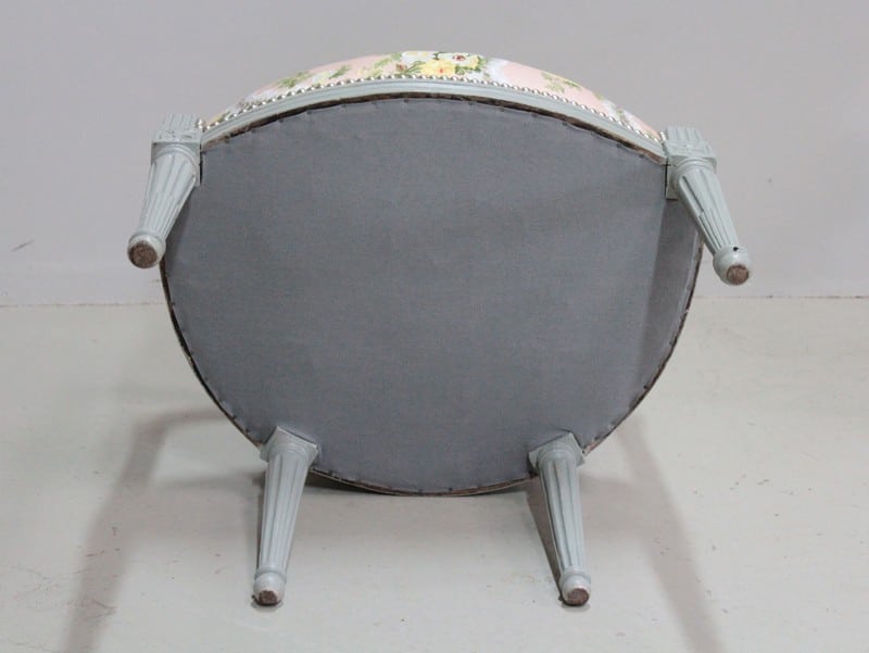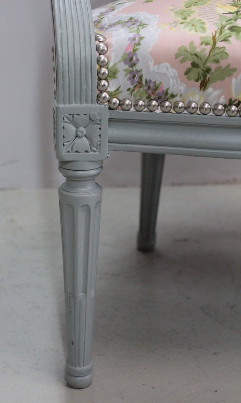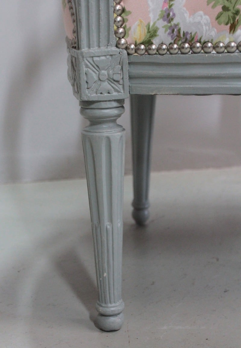 Bois de hêtre peint tons gris, reposant sur 4 pieds cannelés et sculptés de fleurs sur le haut.