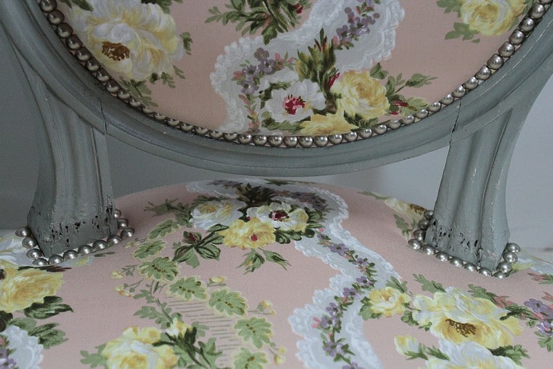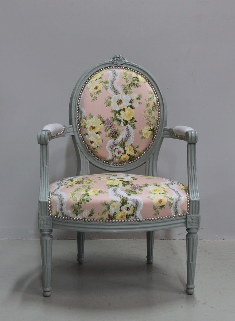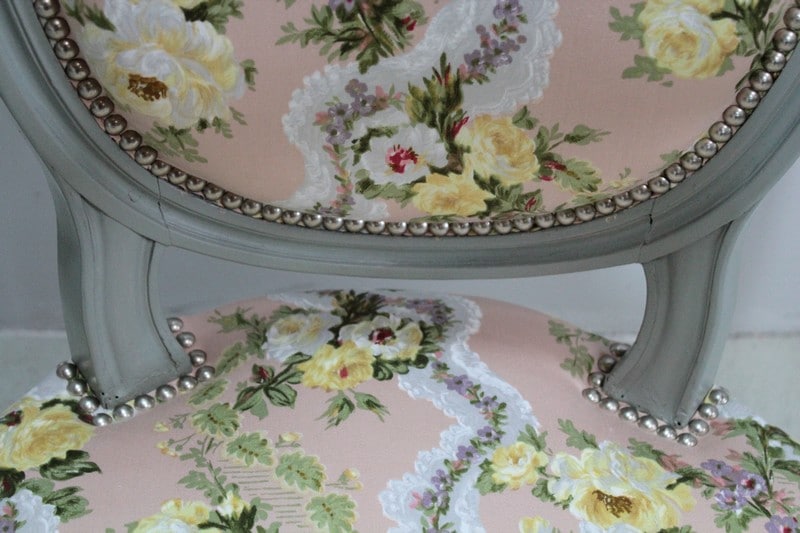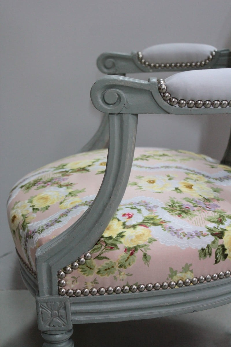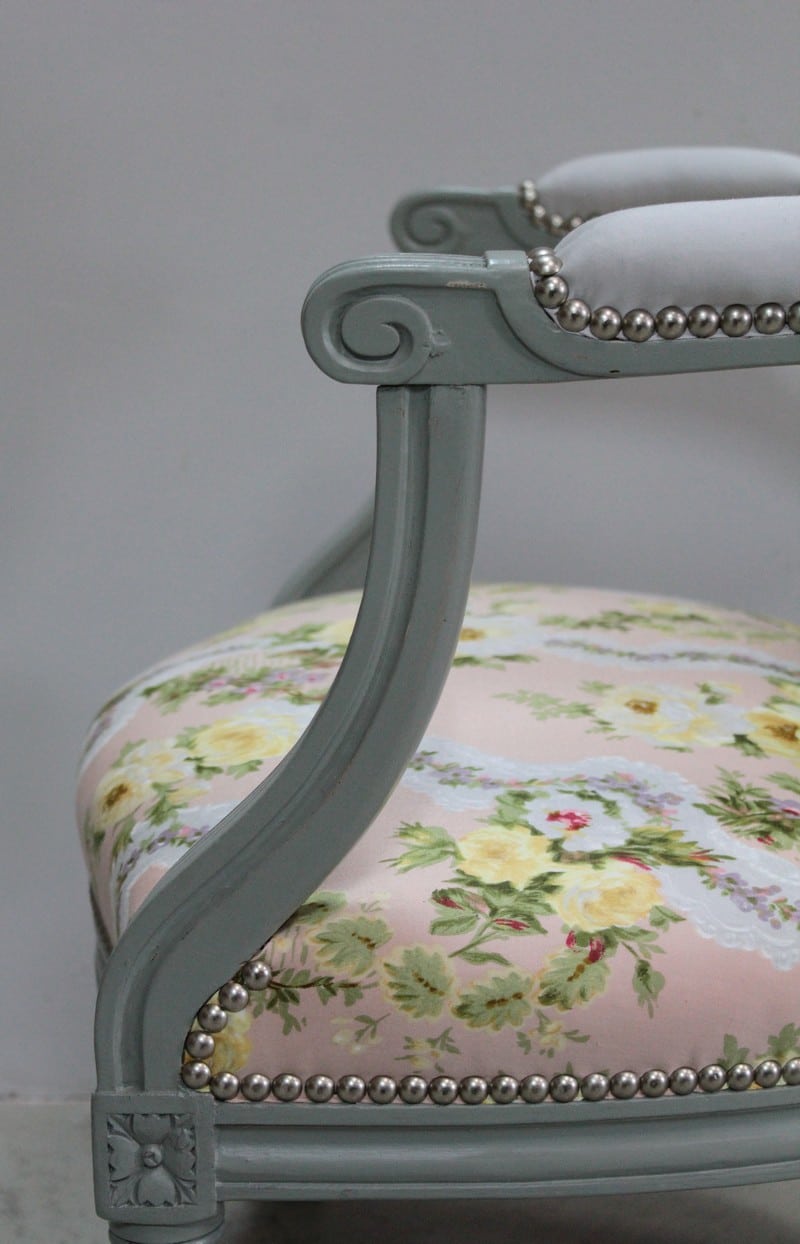 Assises et dos refaits à l’ancienne, ressorts et crin animal, recouverts d’un tissu fleuri, Brionne de chez Chanée Ducroc (85% coton, 15% lin).
