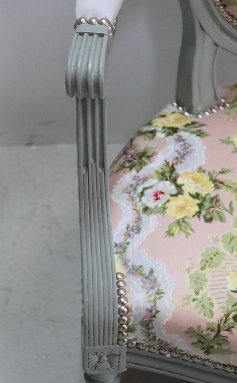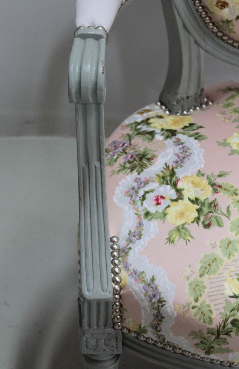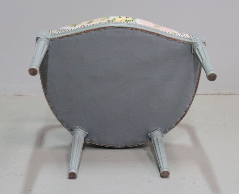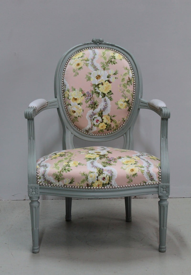 Assises et dos refaits à l’ancienne, ressorts et crin animal, recouverts d’un tissu fleuri, Brionne de chez Chanée Ducroc (85% coton, 15% lin).