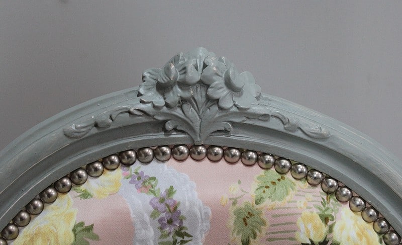 Dossiers médaillon ornés de sculptures au sommet, type marguerites sur l’un et bouton de fleurs sur l’autre.
