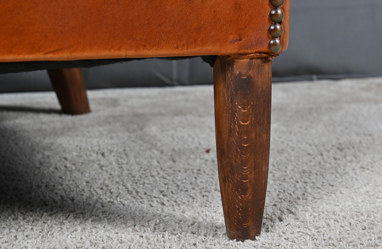 Ces Fauteuils bénéficient d’une structure en pin massif, de devantures en soufflets, de finitions clous vieillis et de pieds en hêtre teintés noirs.