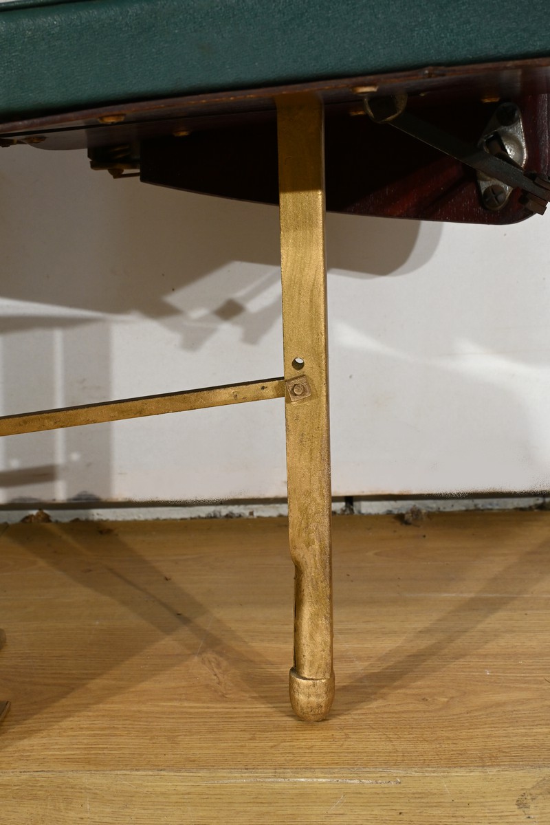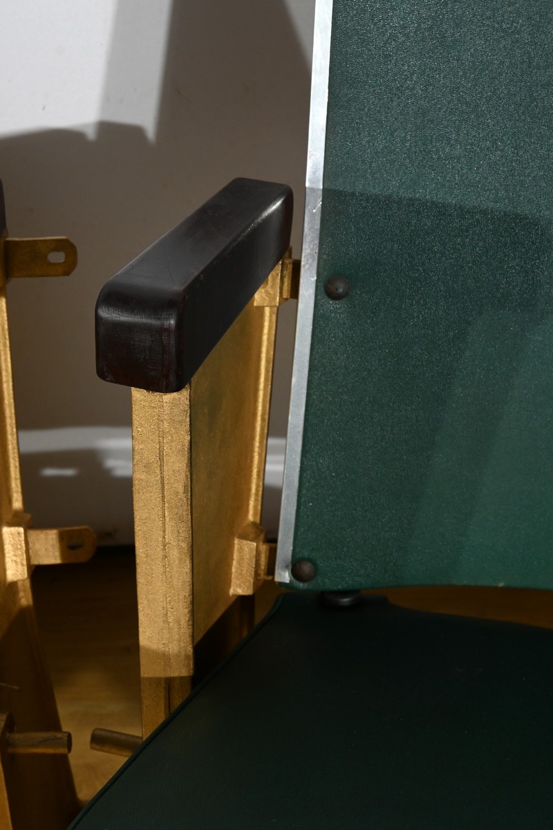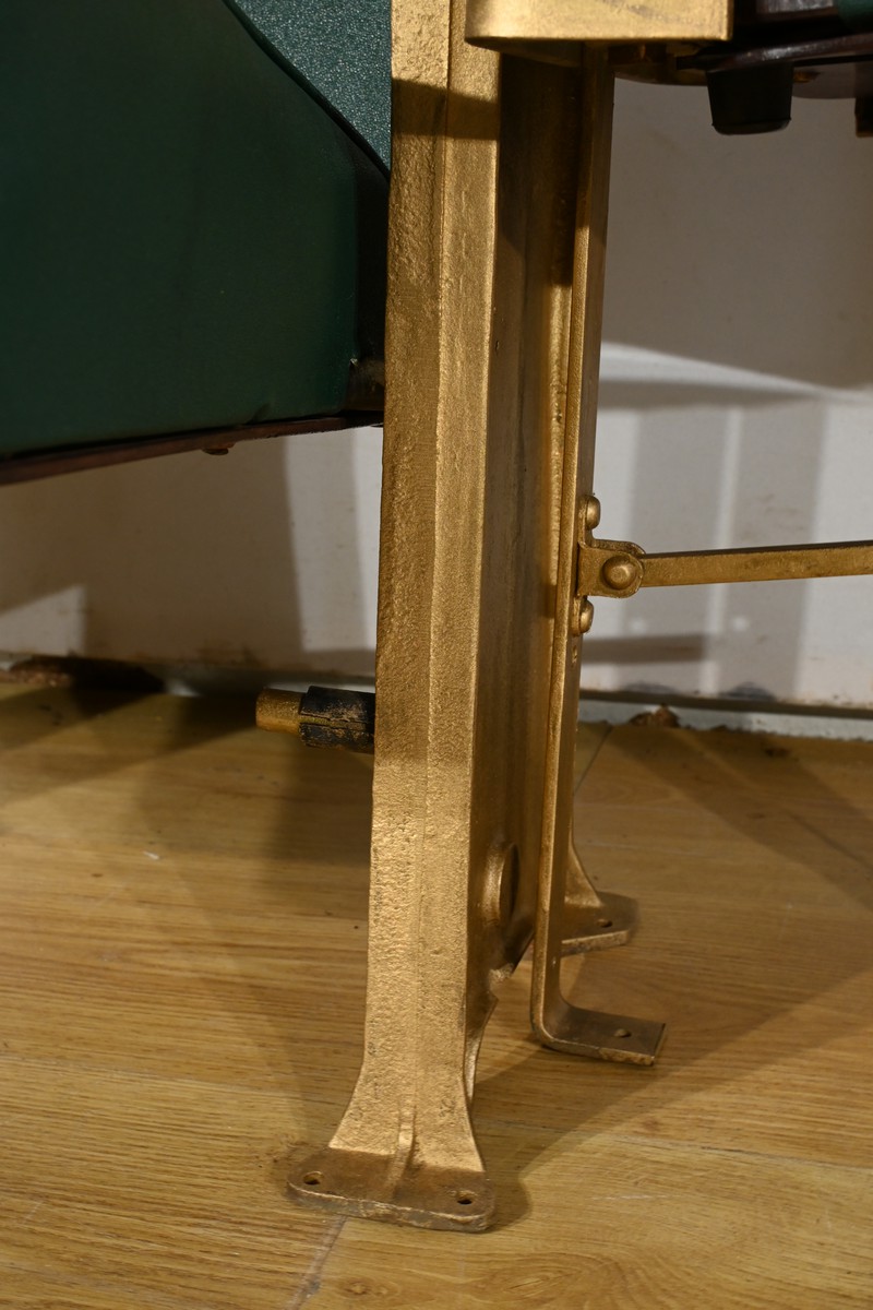 Ces fauteuils sont fabriqués en similicuir vert et acajou, reposant sur deux éléments en fonte dorée, offrant une touche de couleur élégante et rétro.