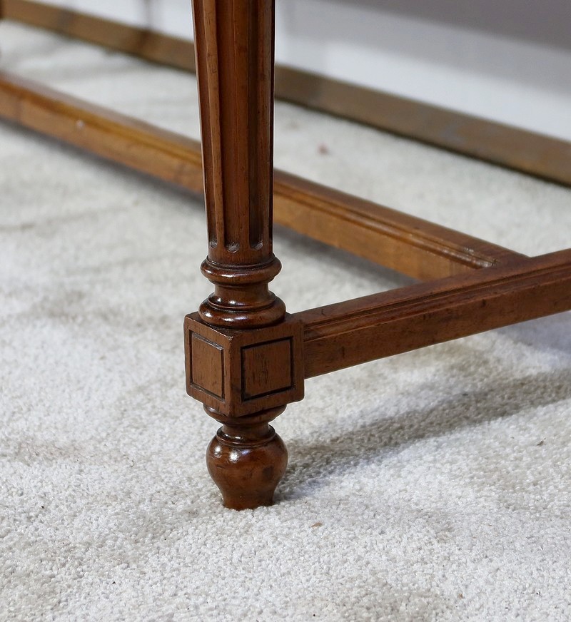 L’ensemble repose quatre pieds tournés à cannelure, reliés par une entretoise dont le dessus comporte 2 gorges symétriques. Ses pieds se terminent chacun par une petite toupie.