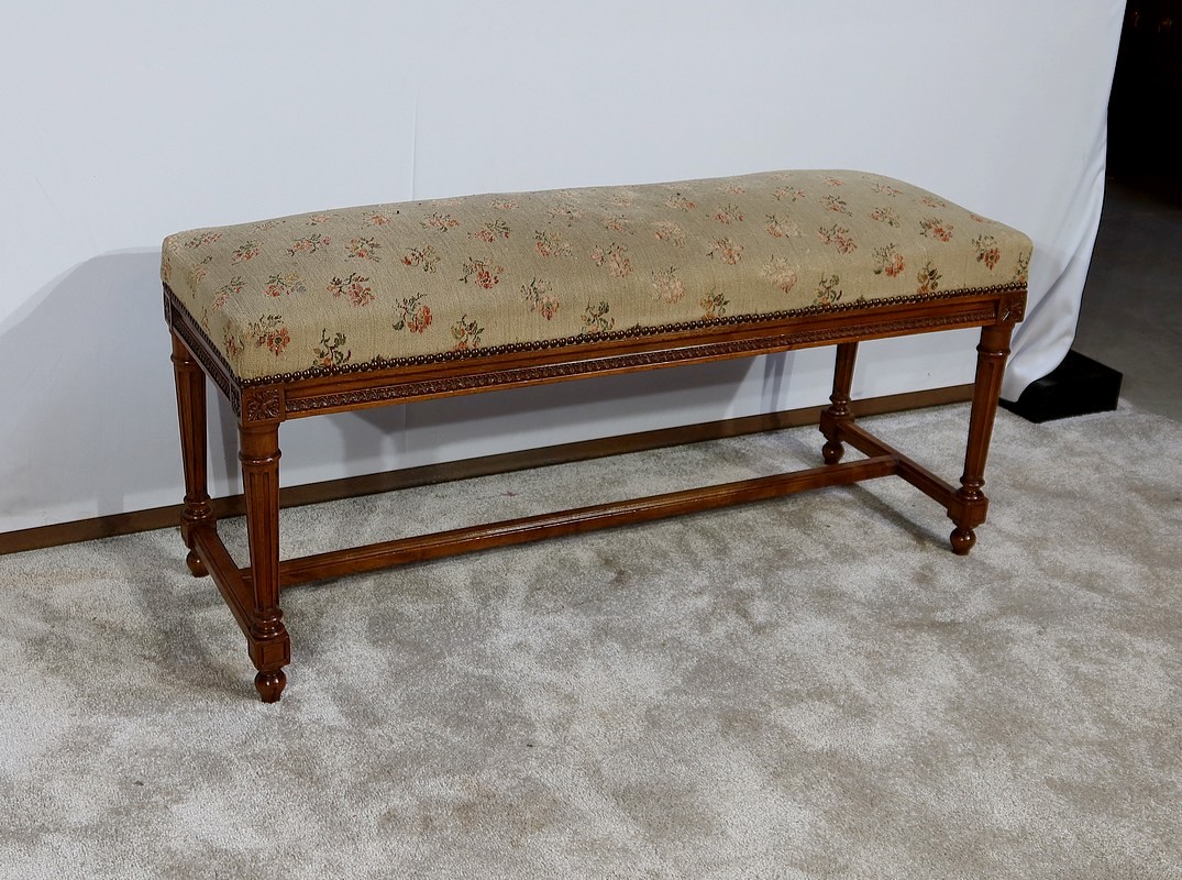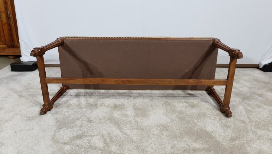Banquette Louise XVI en noyer massif, garnie d’une tapisserie fleurie cloutée et dotée d’une ceinture à réserve. Elle est entourée d’une frise d’oves et agrémentée aux angles de macarons carrés.