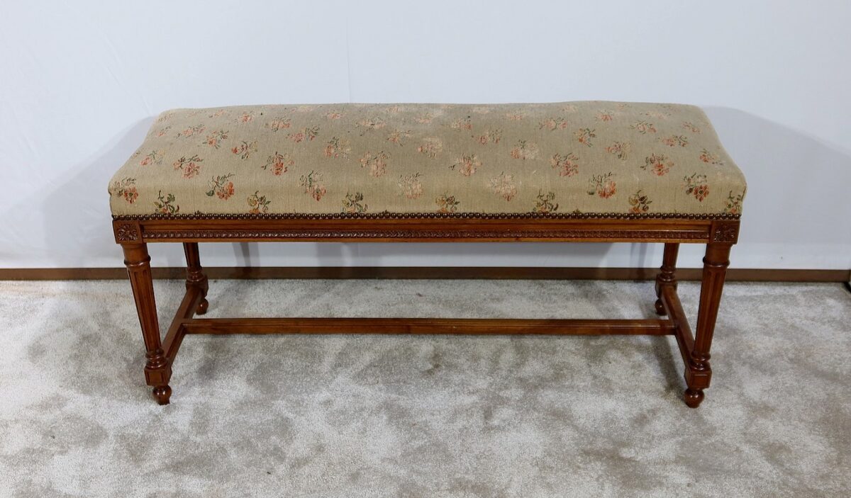 Banquette Louise XVI en noyer massif, garnie d’une tapisserie fleurie cloutée et dotée d’une ceinture à réserve. Elle est entourée d’une frise d’oves et agrémentée aux angles de macarons carrés.
