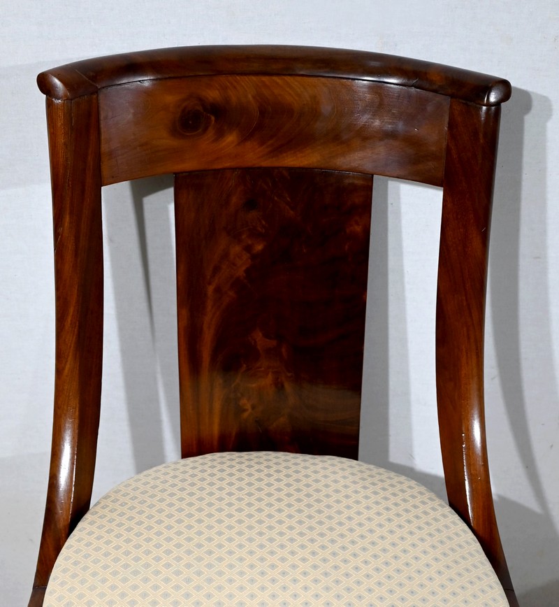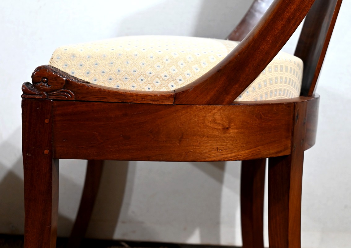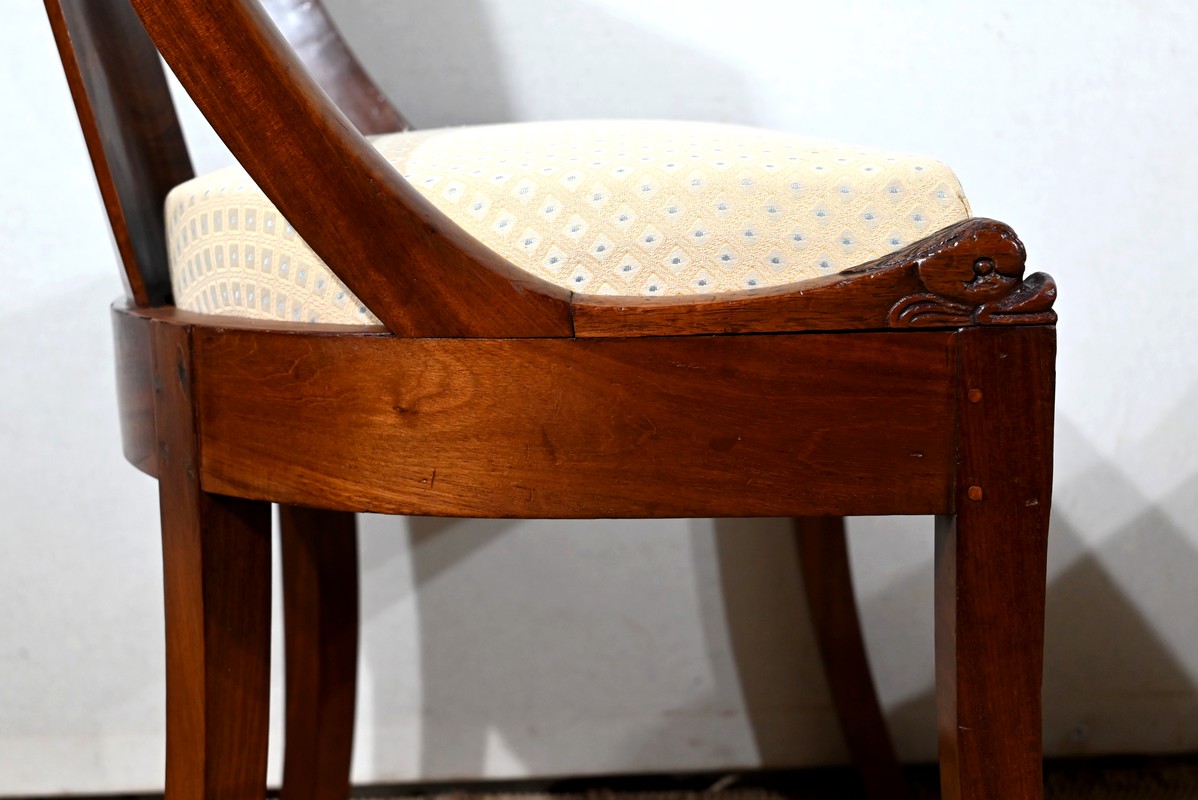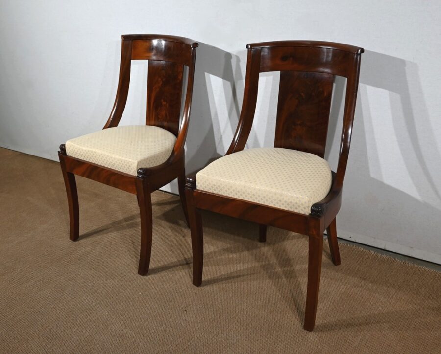 Paire de chaises gondole en acajou massif, à dossier ajouré et incurvé, composé d’un élément central rejoignant une traverse concave. Les montants latéraux en cintre rejoignent la ceinture, plaquée en façade, et se terminent par une sculpture de feuille d’acanthe enroulée.