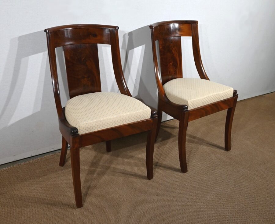 Paire de chaises gondole en acajou massif, à dossier ajouré et incurvé, composé d’un élément central rejoignant une traverse concave. Les montants latéraux en cintre rejoignent la ceinture, plaquée en façade, et se terminent par une sculpture de feuille d’acanthe enroulée.
