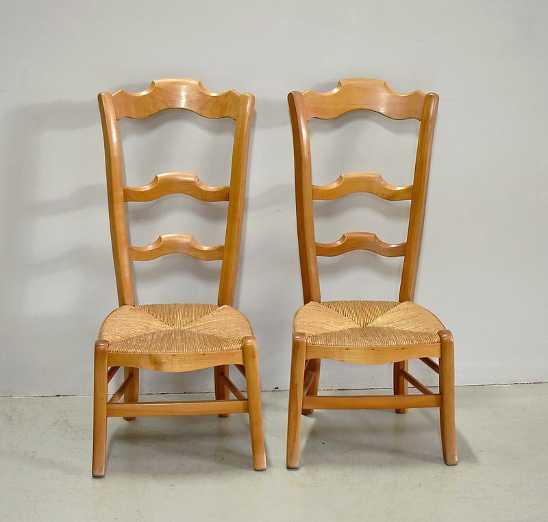 Paire de chaises basses à langer à dossier haut en merisier.
