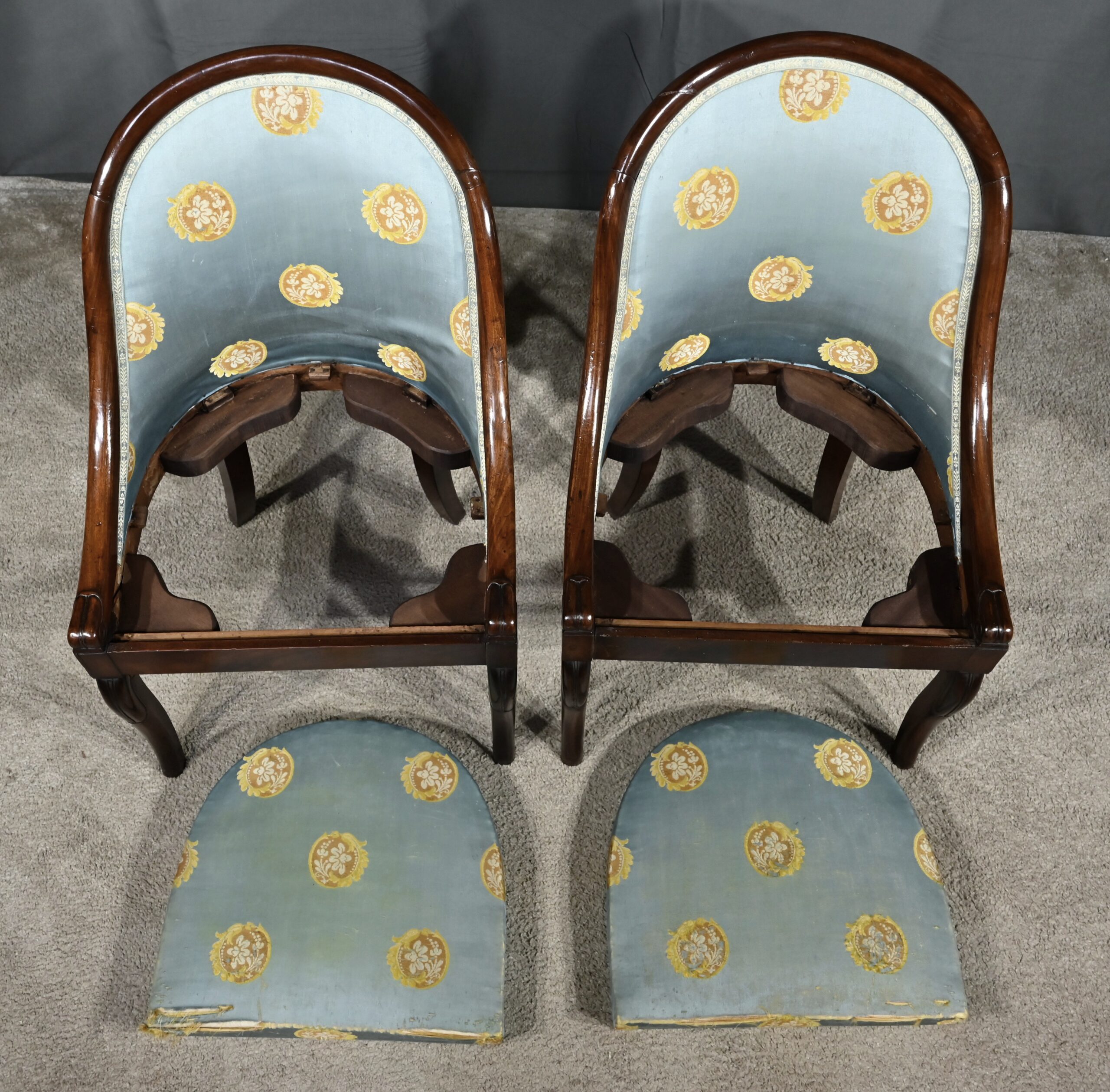 Bel ensemble de chaises en acajou massif dotées d’un dossier gondole enveloppant muni d’un long bandeau en acajou cintré et d’une garniture de soierie d’origine, bleue irisée.