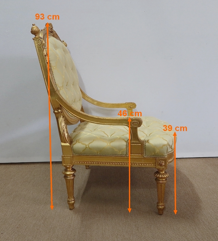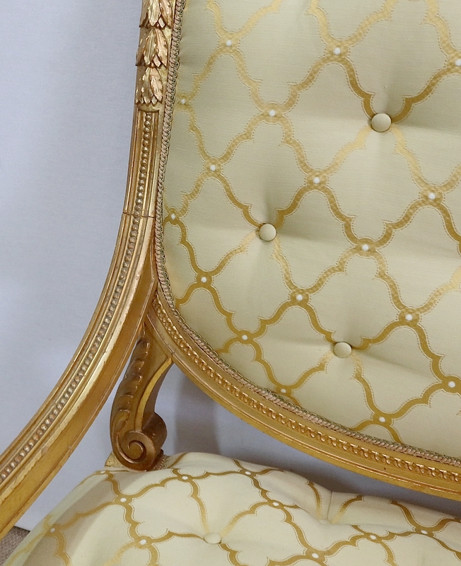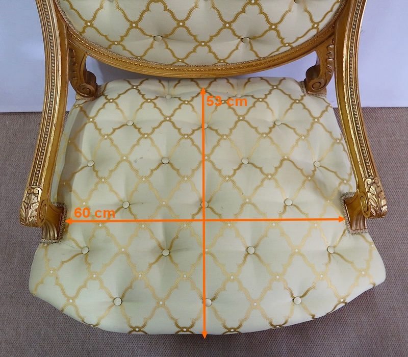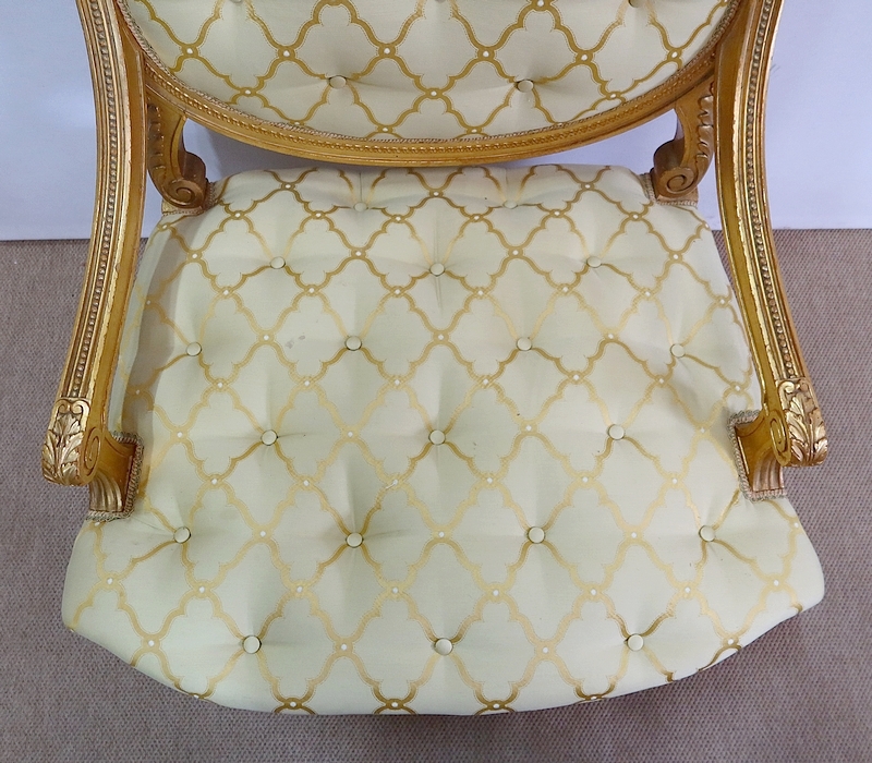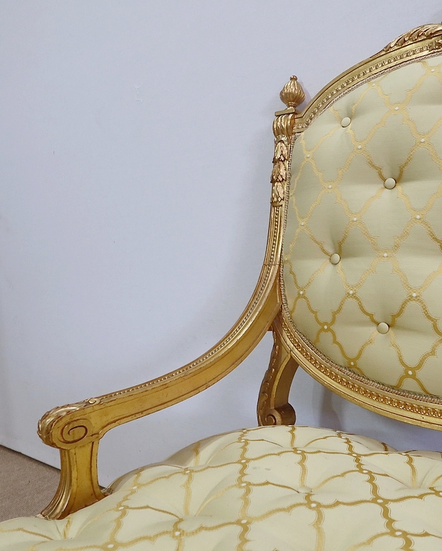Élégants fauteuils dits « Marquise » en bois doré de style Louis XVI et d’époque Napoléon III munis d’une assise importante traditionnelle, sangles, ressorts et crin. Cette assise très confortable bénéficie d’une finition dite à capiton sur un tissu à fond jaune pâle garni de motifs dorés, rappelant la boiserie dorée à la feuille.