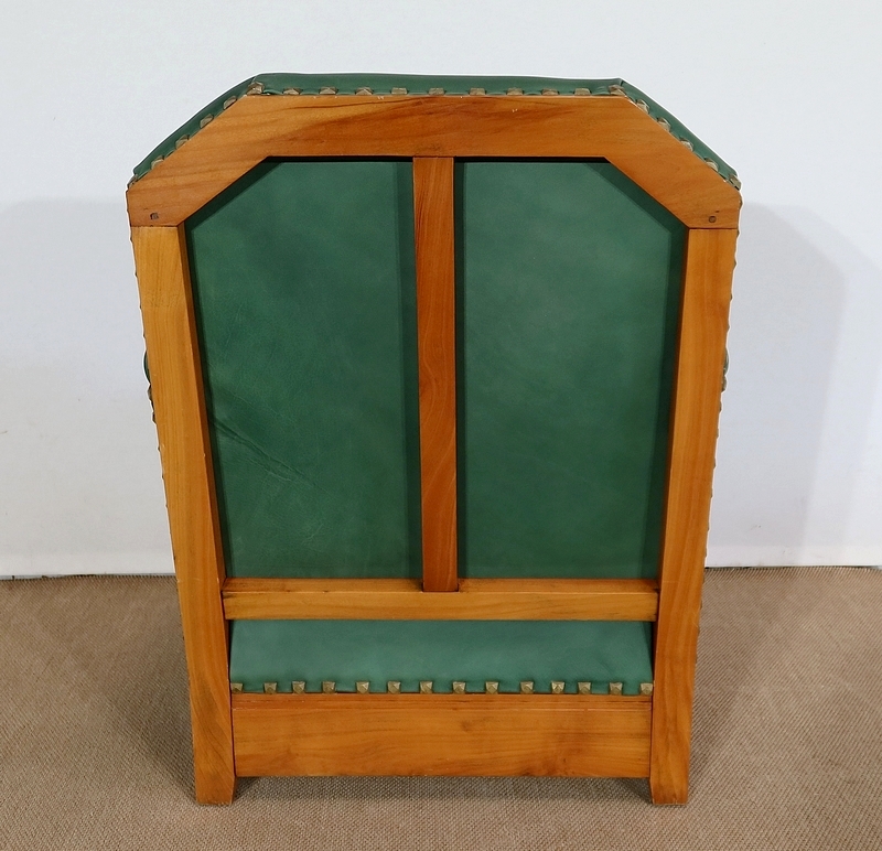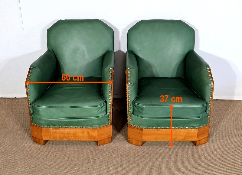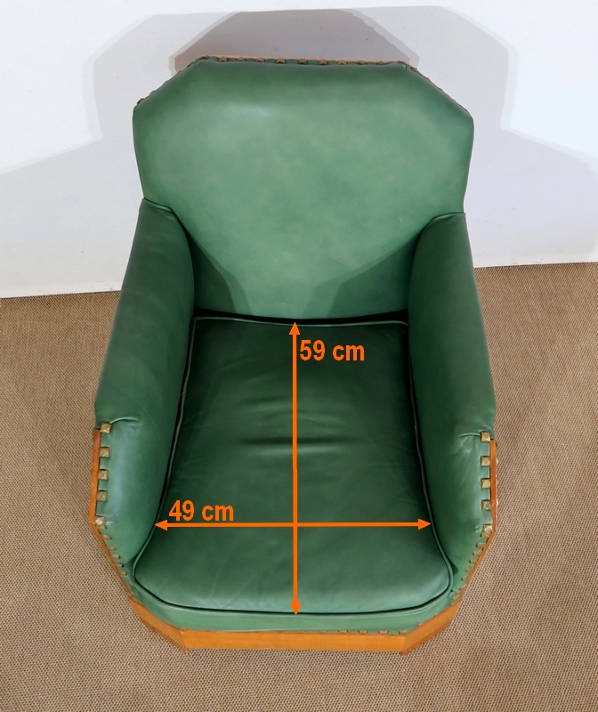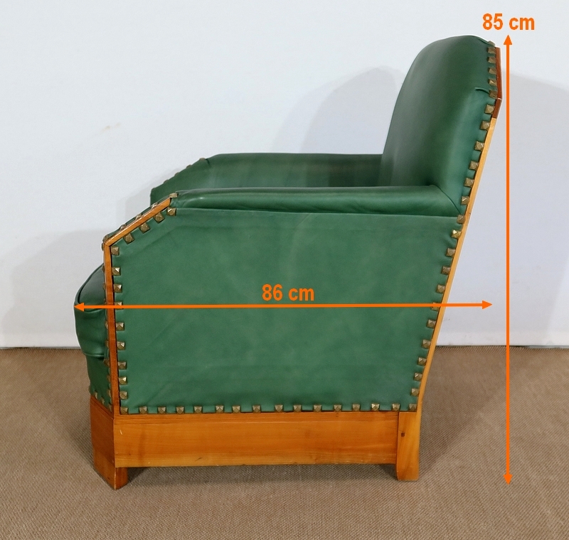 Chaque fauteuil bénéficie d’une ossature en merisier massif garnie d’un Similicuir de couleur « vert anglais ».