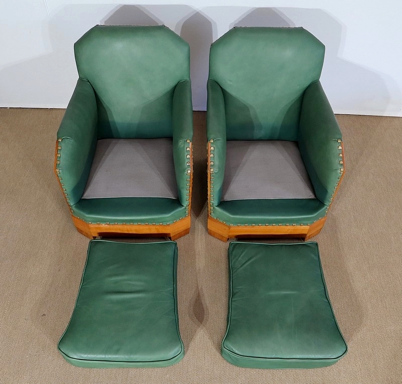Paire de grands fauteuils profonds et enveloppants de style Art déco se distinguant par des lignes droites et un design épuré.
