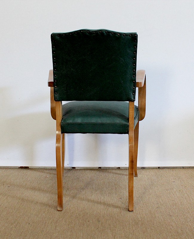 Garnies de Skaï Vert Mélèze entouré de Coutures Gansées et Cloutées au dos, ces Chaises présentent une Assise Ferme et un Dossier Restaurés dans notre Atelier.