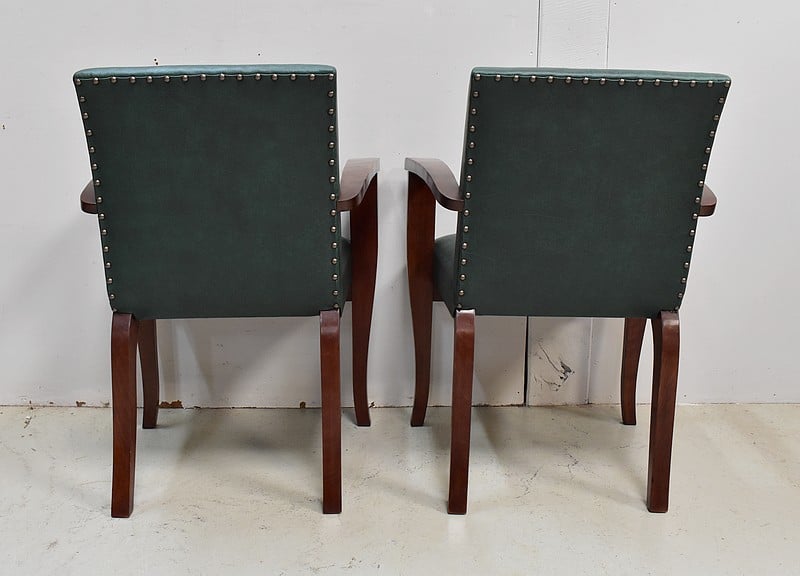 Ces Fauteuils d’hier, parfaitement adaptés aux Intérieurs d’aujourd’hui, ont bénéficié d’une restauration de Qualité. Ils constituent une Élégante Paire de Sièges qui pourra aussi bien être installée dans un Bureau que dans un Salon, ou encore aux extrémités d’une Table.