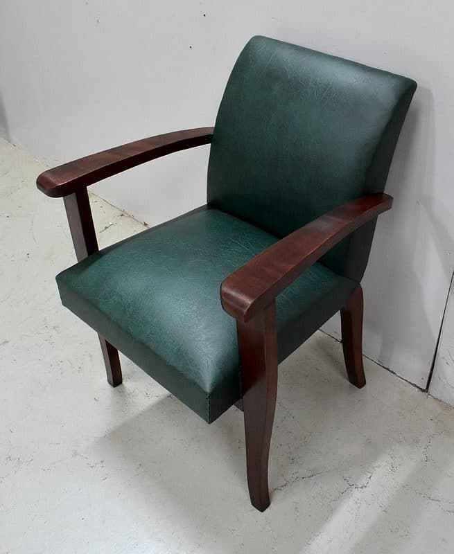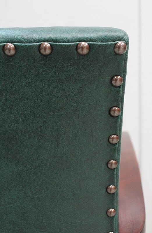 Les dossiers, sensiblement inclinés, ainsi que les assises, sont confortablement garnis. Ils sont recouverts d’un joli Skaï couleur Vert Forêt, très tendance. Ce revêtement, actuel mais artisanal, est à finitions Clous sur l’arrière des dossiers.