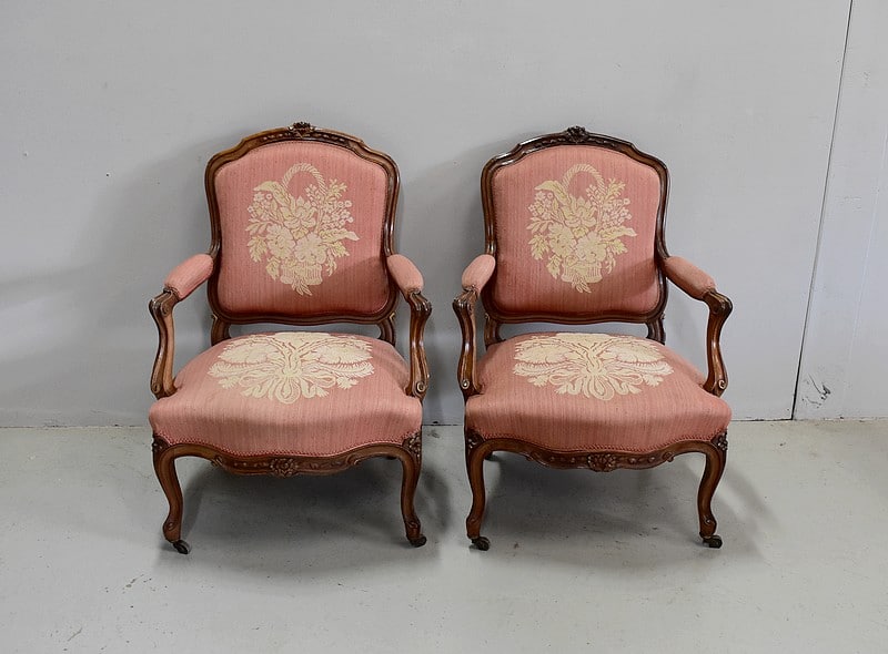 Les assises en l’état, ont été refaites antérieurement et sont recouvertes d’un tissu rose à décors d’un panier de fleurs sur le dossier et d’un bouquet sur l’assise, de couleurs jaune et crème.