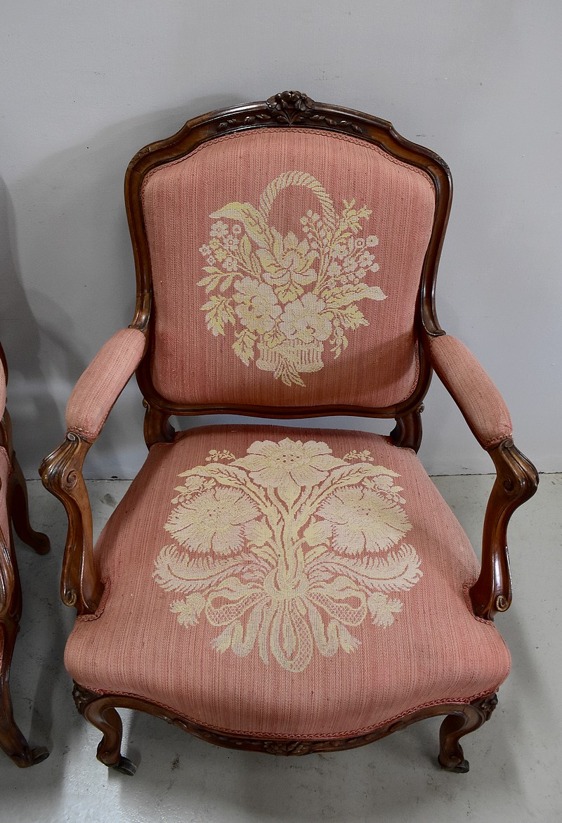 Le haut du dossier, ainsi que les accotoirs, la traverse basse et les pieds sont sculptés de fleurs et moulurés.