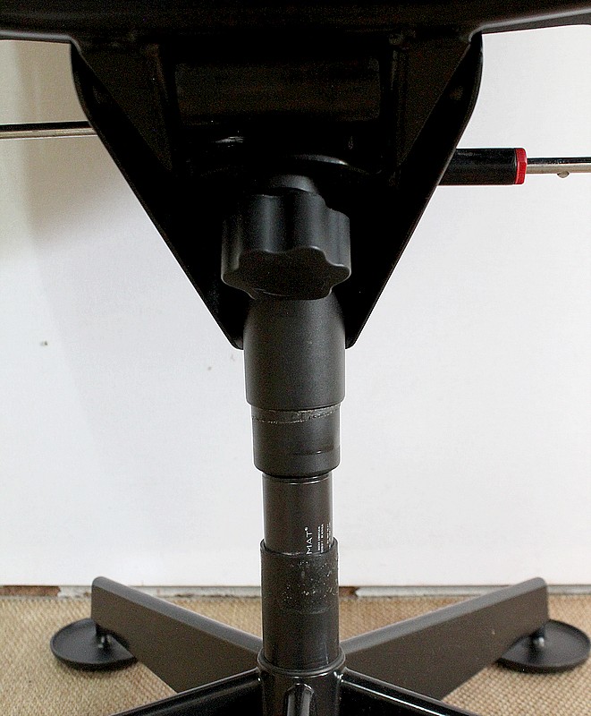 L’ensemble se soutient sur un pied étoile formé de cinq branches, elles-mêmes reposant sur de larges patins ronds en métal noir. Ce pied pivotant permet plusieurs réglages grâce à la présence d’une manette de chaque côté : une à gauche permettant l’ajustement de la hauteur de l’assise puis une seconde, à droite, permettant d’adapter le degré d’inclinaison du siège. Ces leviers sont en parfait état de fonctionnement.