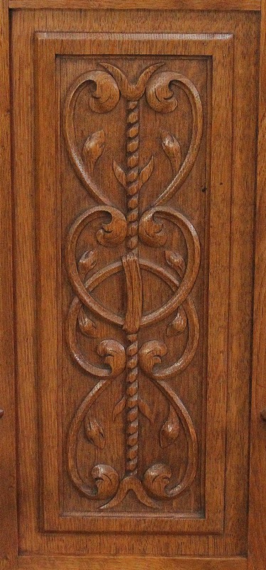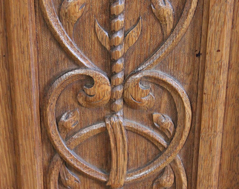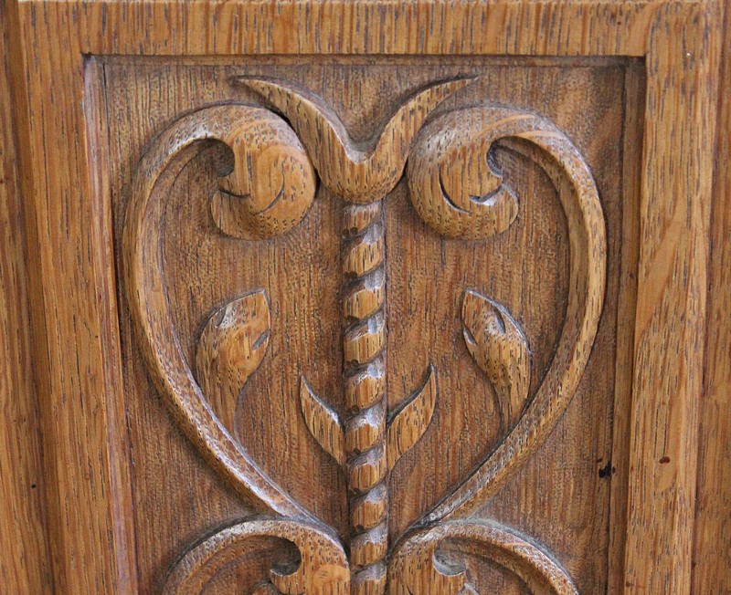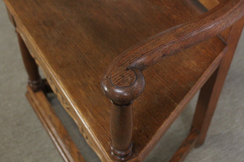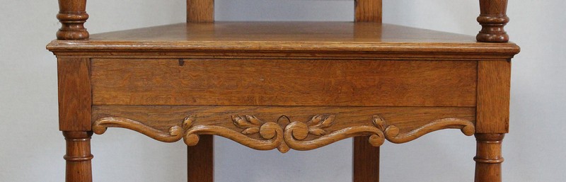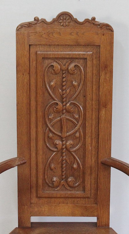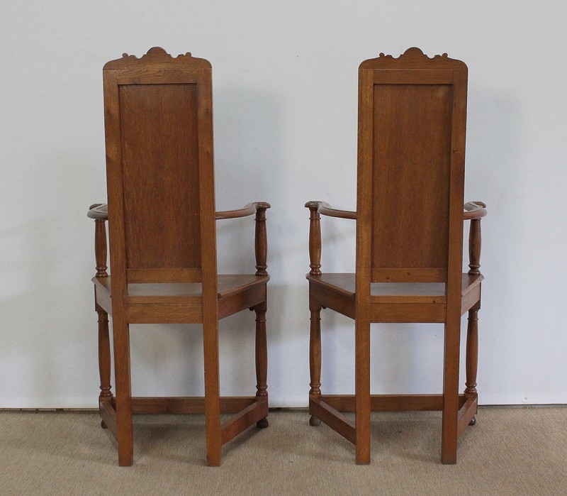 Les étroits Dossiers présentent un panneau intérieur à défoncement avec Dessins de Volutes entourant une longue Tige Torsadée. Ce dossier est sommé d’un élément de bois découpé avec une Fleur au centre.