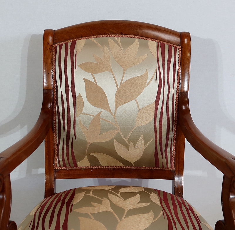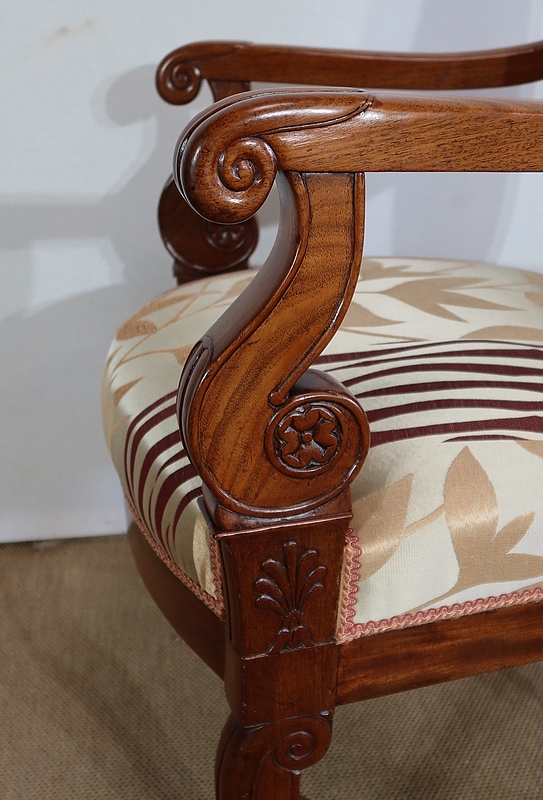 La continuité des pieds arrière se fait par une console renversée soutenant les accotoirs lisses. Sur les côtés, nous découvrons des ornementations sculptées représentant des rosaces et des palmettes.